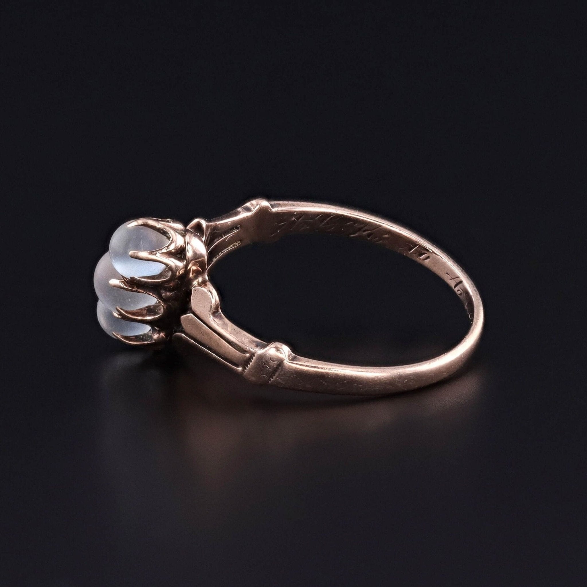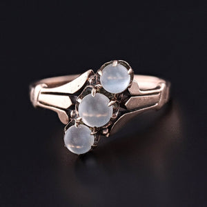 Antique Moonstone Ring: Celebrate the mystery of moonstone with this antique ring from the turn of the 20th century (circa 1890-1910). The ring features a slant of three undrilled moonstone beads set in pale 10k rose gold.