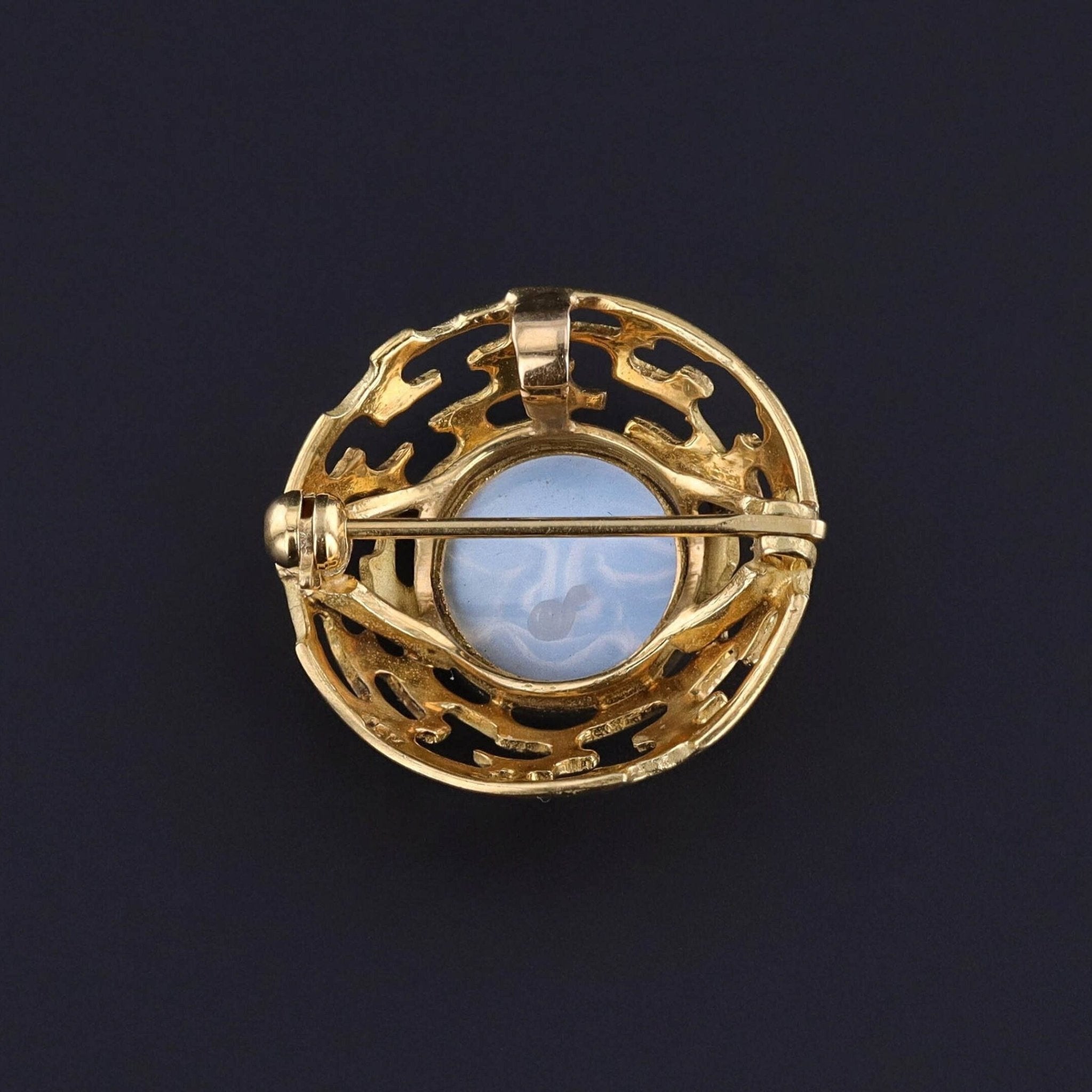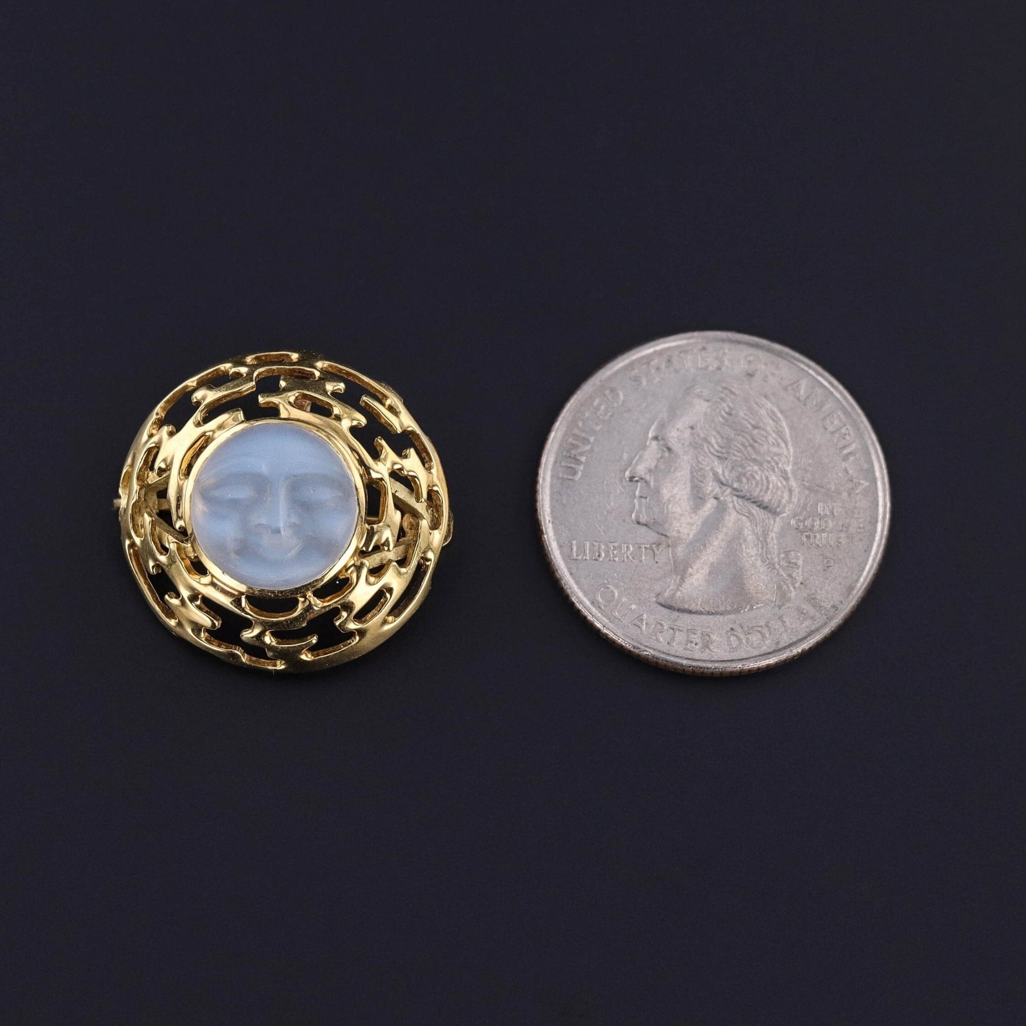 Vintage Man in the Moon Pendant Brooch: This alluring carved moonstone pendant brooch (circa 1980-2000) was made by Skylight Jewelers of Boston, MA. The luminous jewel is set in 18k gold and bears the "S" maker's mark on the gold and on the reverse of the moonstone.