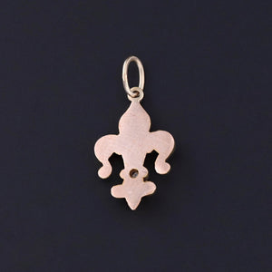 This charm feature a fleur de lis of 14k gold with a single cut diamond accent. The piece was originally an antique stickpin (circa 1900) that our jeweler transformed by removing the pin and adding a 14k gold jump ring bail.