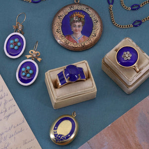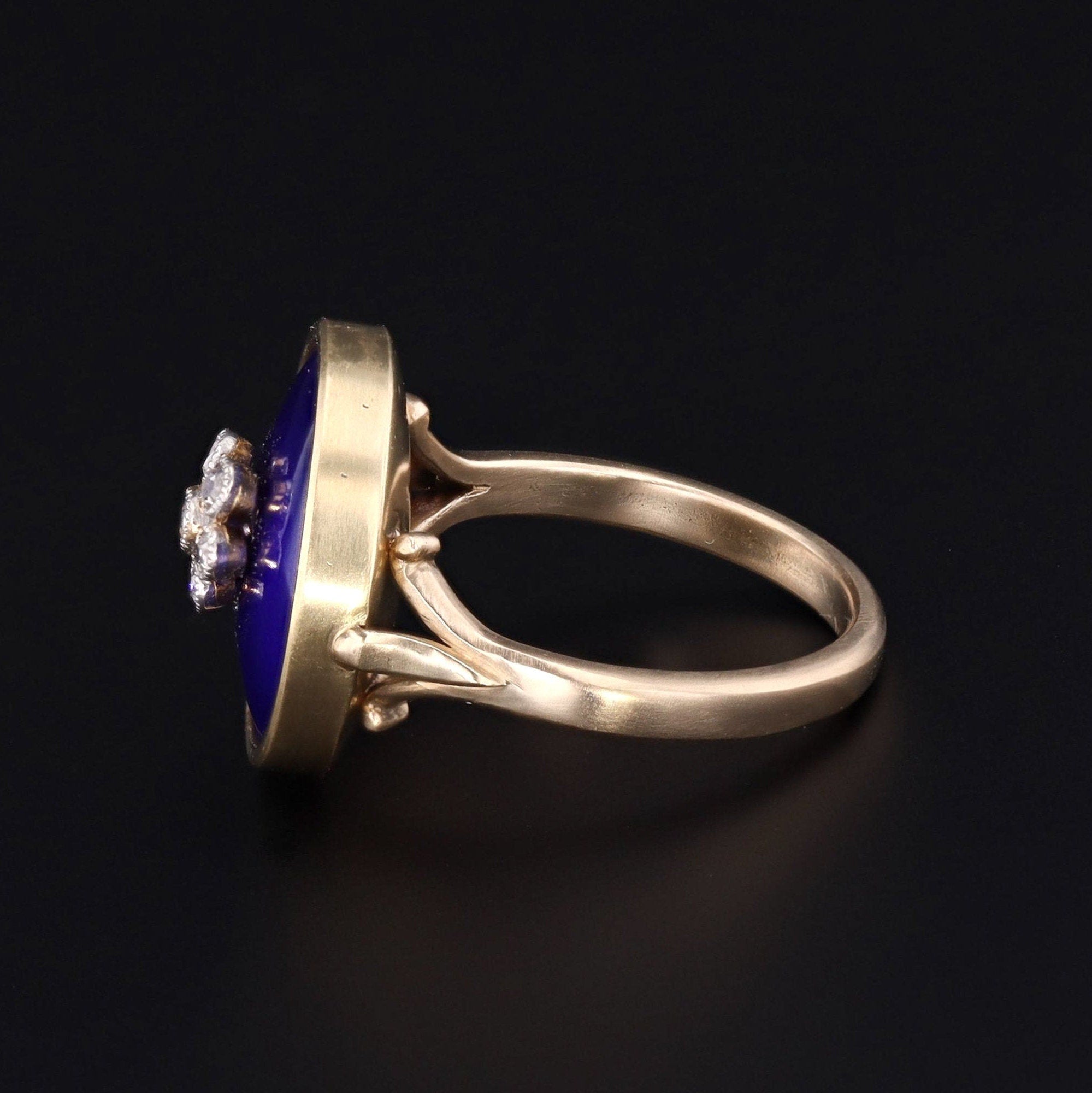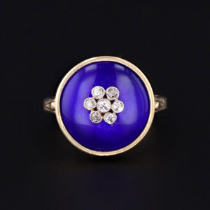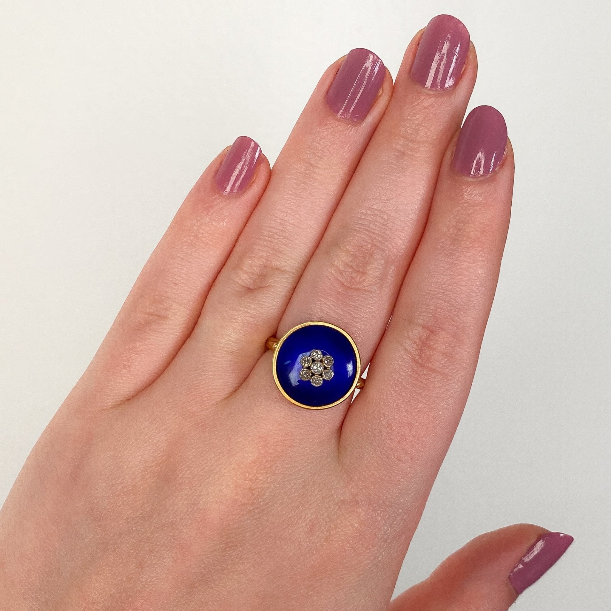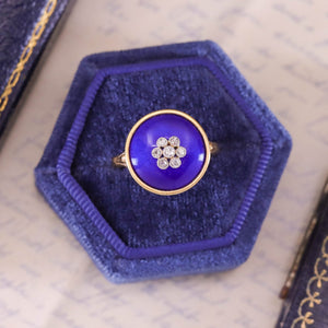 Crafted in 14k gold and professionally verified through XRF (X-ray fluorescence) analysis and jeweler’s acid testing, the ring features rich cobalt blue enamel that radiates a luminous depth. At its center, a floral motif glistens with antique diamonds, adding a refined brilliance to the saturated enamel ground.