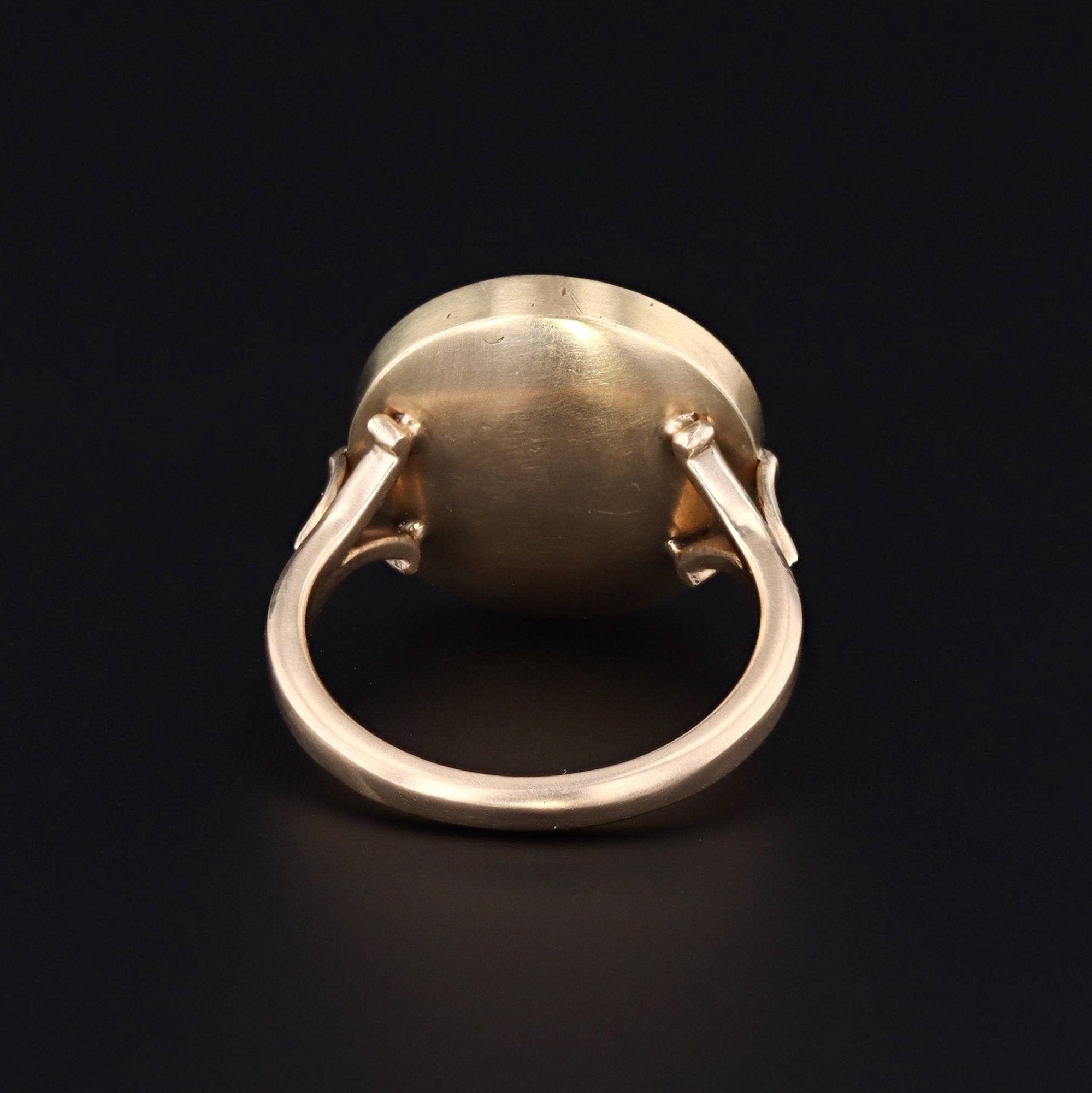 The face of the ring measures approximately 0.65 inches in diameter, offering a bold yet feminine presence on the hand. It is currently a size 7.25, and can be re-sized to suit upon request (for an additional charge).