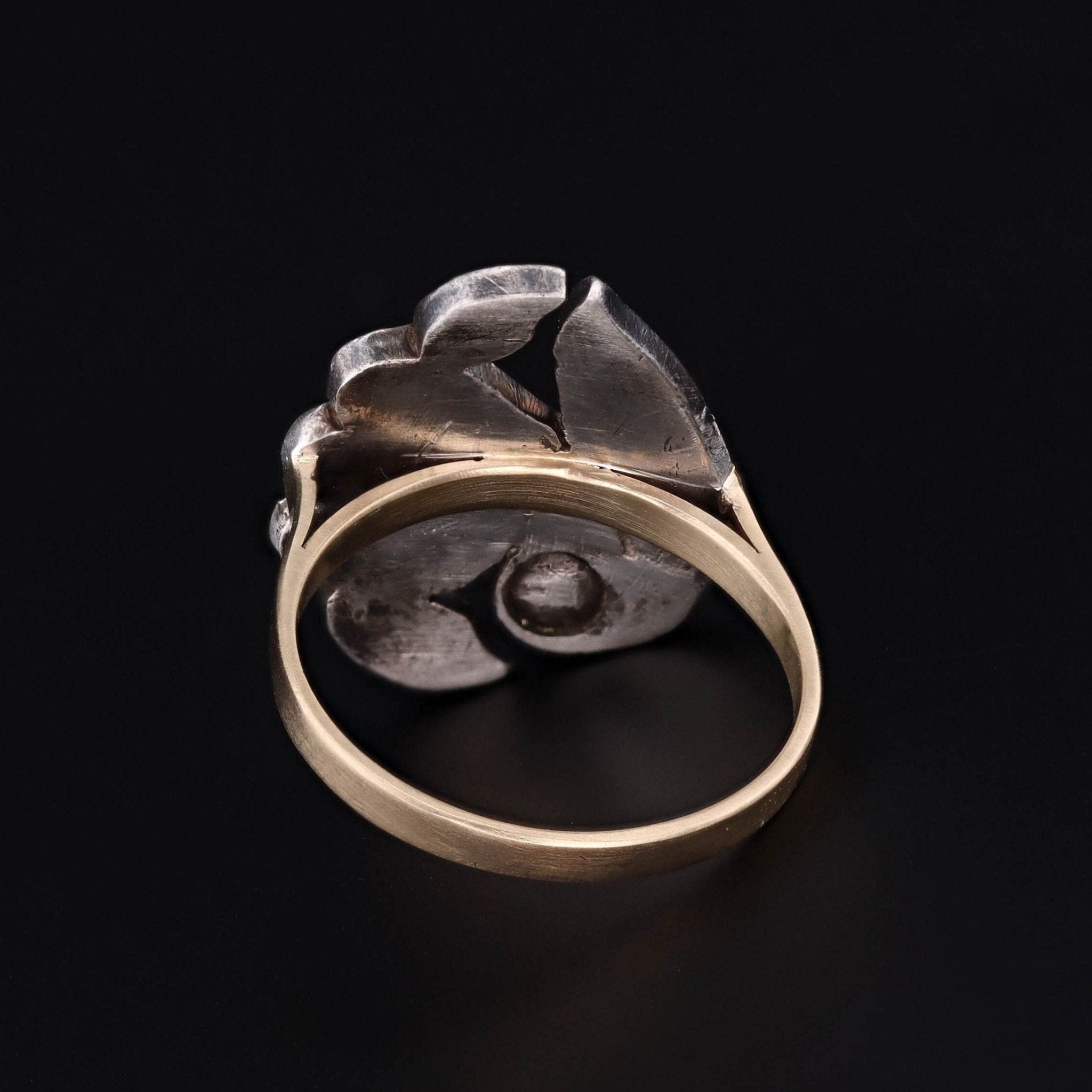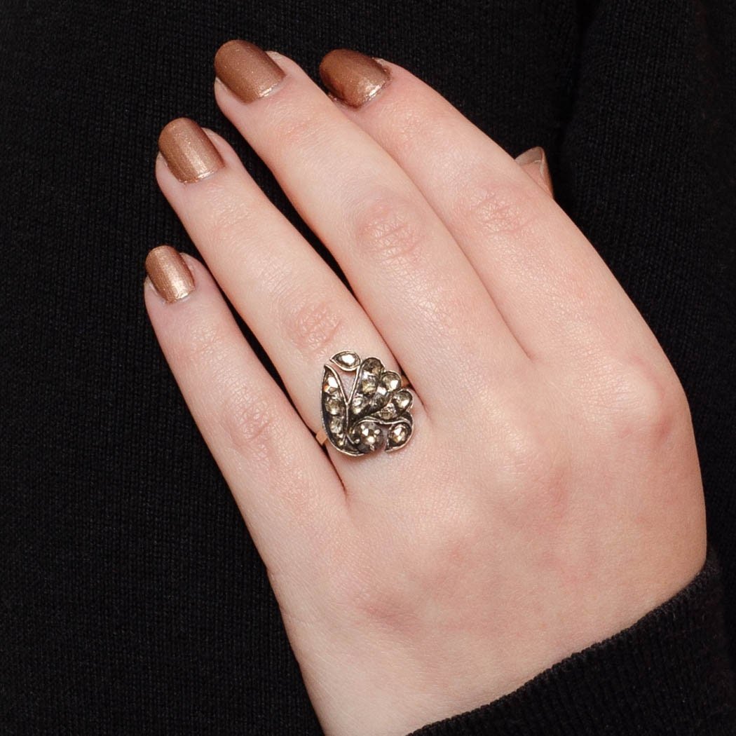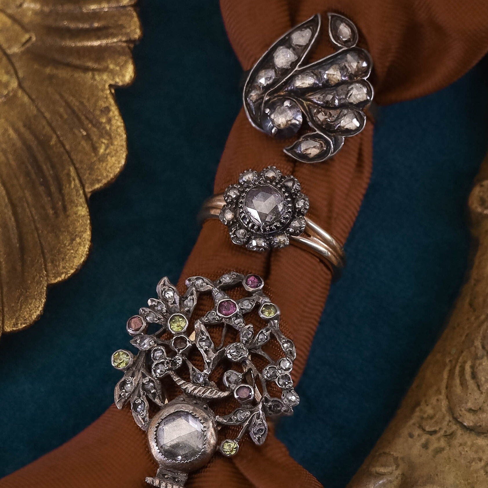 Steeped in nearly two centuries of history, this exquisite ring features a jewel from the early 19th century, originally part of an antique pin (circa 1830-1840). The top showcases a luminous cluster of closed-back rose cut diamonds set in silver, a hallmark of Georgian-era craftsmanship. Our jeweler has thoughtfully transformed the piece for modern wear by adding a 14k yellow gold mounting, creating a timeless fusion of antique artistry and contemporary elegance.
