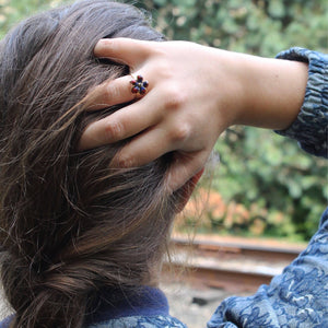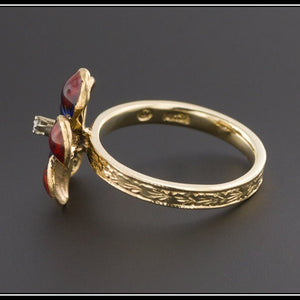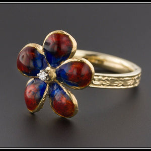 Charming and distinctive, this ring was thoughtfully created from a vintage 14k gold pin (circa 1950–1960). The enameled flower was carefully removed and welded onto a vintage 14k gold band, transforming it into a striking one-of-a-kind jewel.