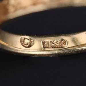 The band, encircled with a continuous gold design, makes the ring both sculptural and unique. Because of this all-around motif, the ring is currently a size 6 and cannot be resized. It remains in very good vintage condition.