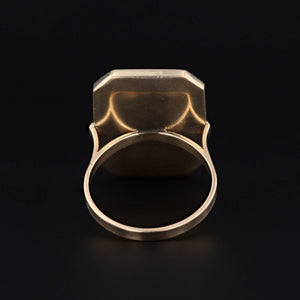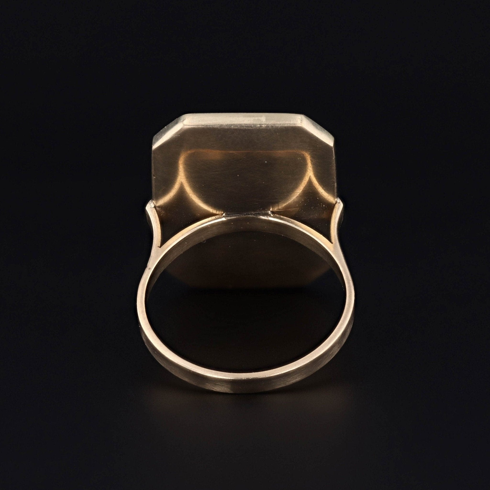 The face of the ring measures 0.85 inches by 0.65 inches wide, and it is in very good condition with a small surface scratch to the bottom right corner. It is currently a size 7, but it can be resized for an additional charge.
