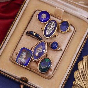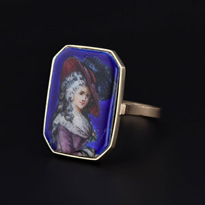 This ring was converted from an antique pin (circa 1880) by removing the pin stem and adding a 14k gold mounting. The enamel piece depicts a finely dressed 18th-century woman in delicate detail.