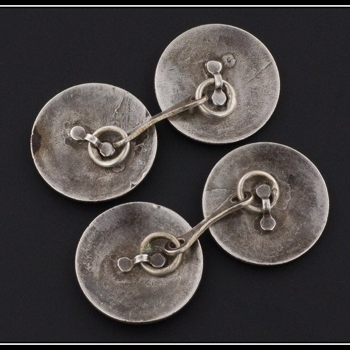 Each cufflink measures 0.65 inches in diameter. Though unmarked, the metal has been confirmed as sterling silver through traditional jeweler’s acid testing and XRF analysis.