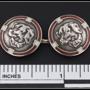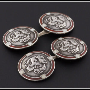 These magnificent cufflinks celebrate the beloved dachshund, finely rendered in sterling silver and framed by a red and white enamel border. With their long snouts and floppy ears, the dogs’ distinctive features are captured with remarkable charm and detail, making these cufflinks a delightful statement piece for any canine enthusiast or collector of novelty jewels.