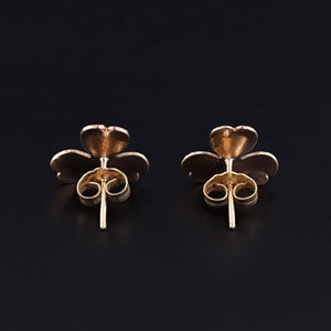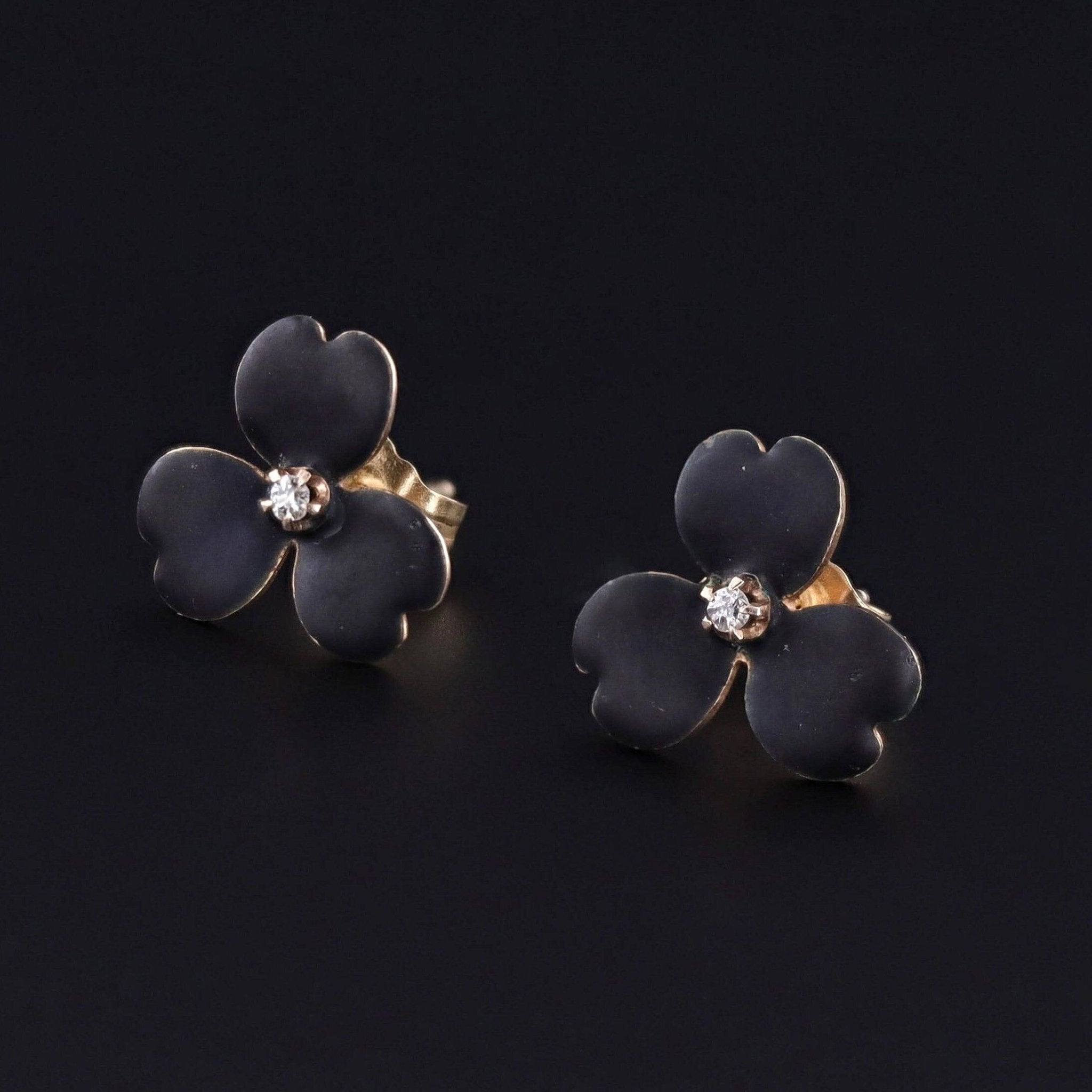 These earrings feature shamrocks of 14k gold with black enamel and diamond accents. They were originally part of an antique brooch (circa 1910) that our jeweler transformed by adding 14k posts and backs.