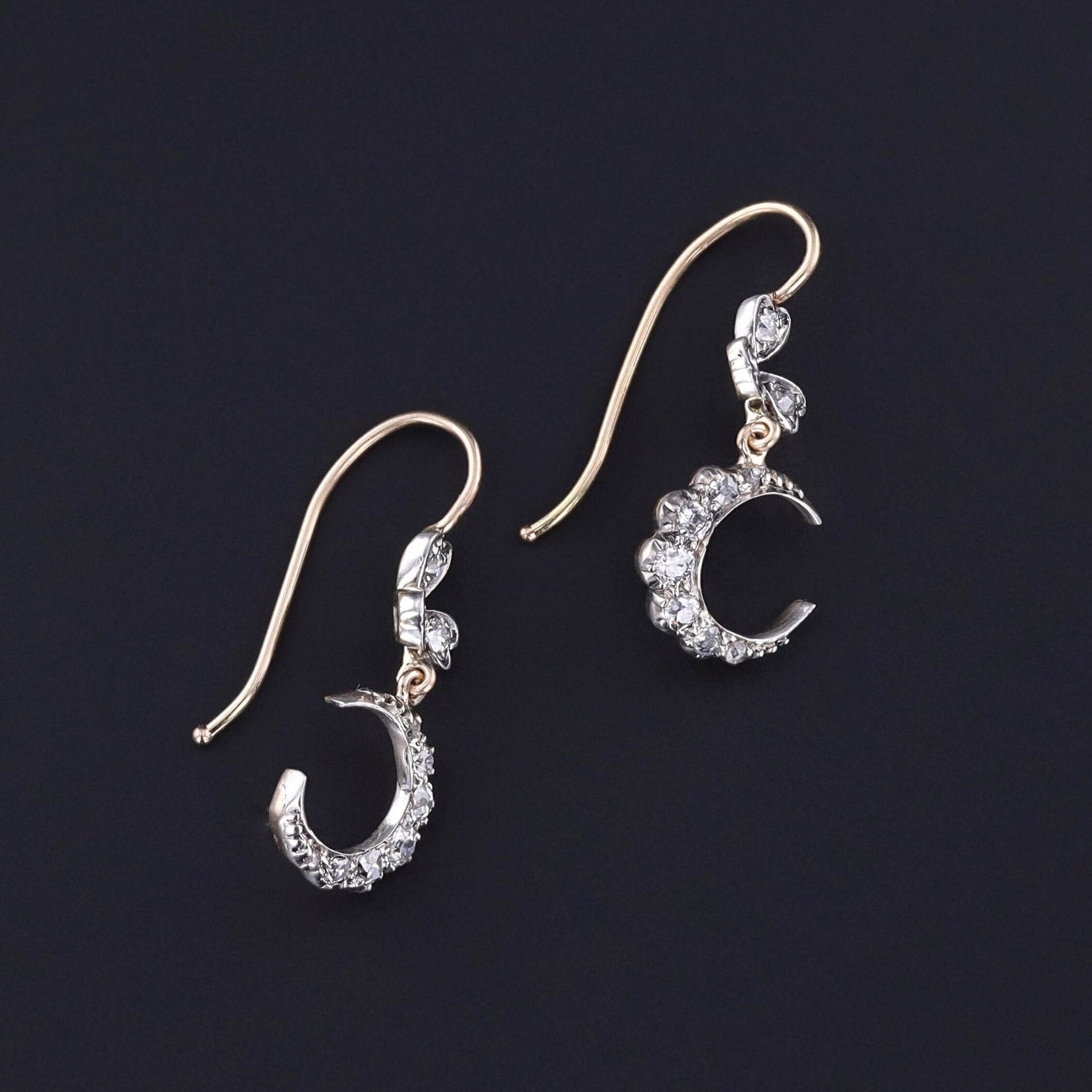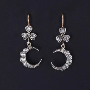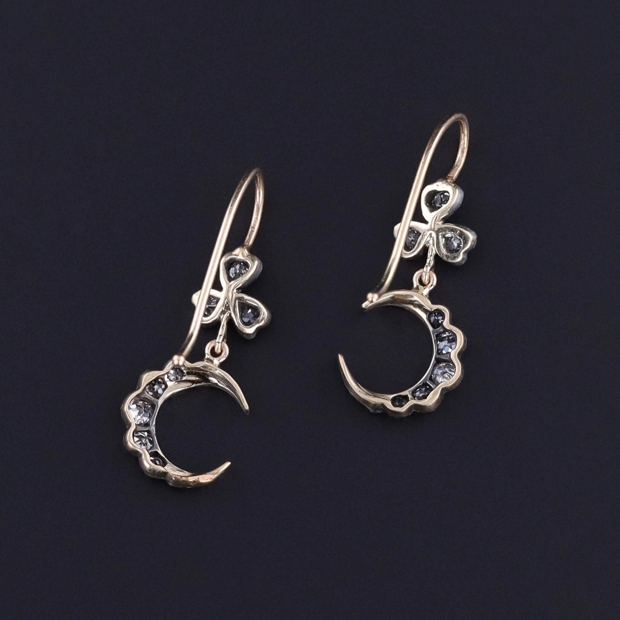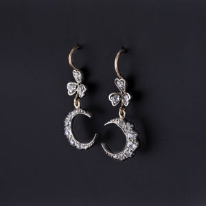 Diamond Crescent Earrings: Elevate your style with these exquisite earrings adorned with old mine cut diamond crescents and clovers. The diamond studded drops are silver topped 14k gold and were originally antique brooch components dating back to circa 1890. The 14k gold ear wires are new additions.