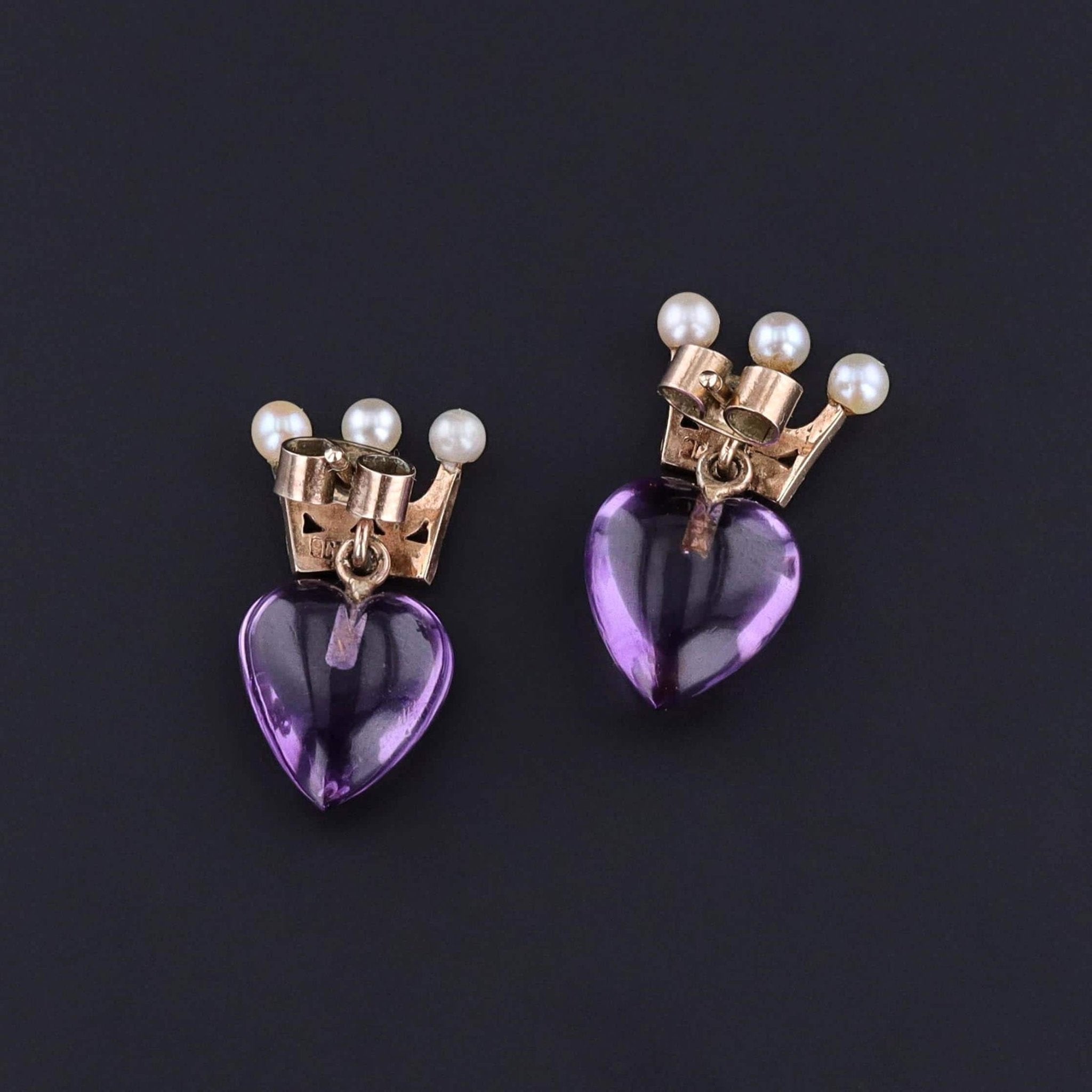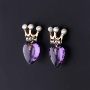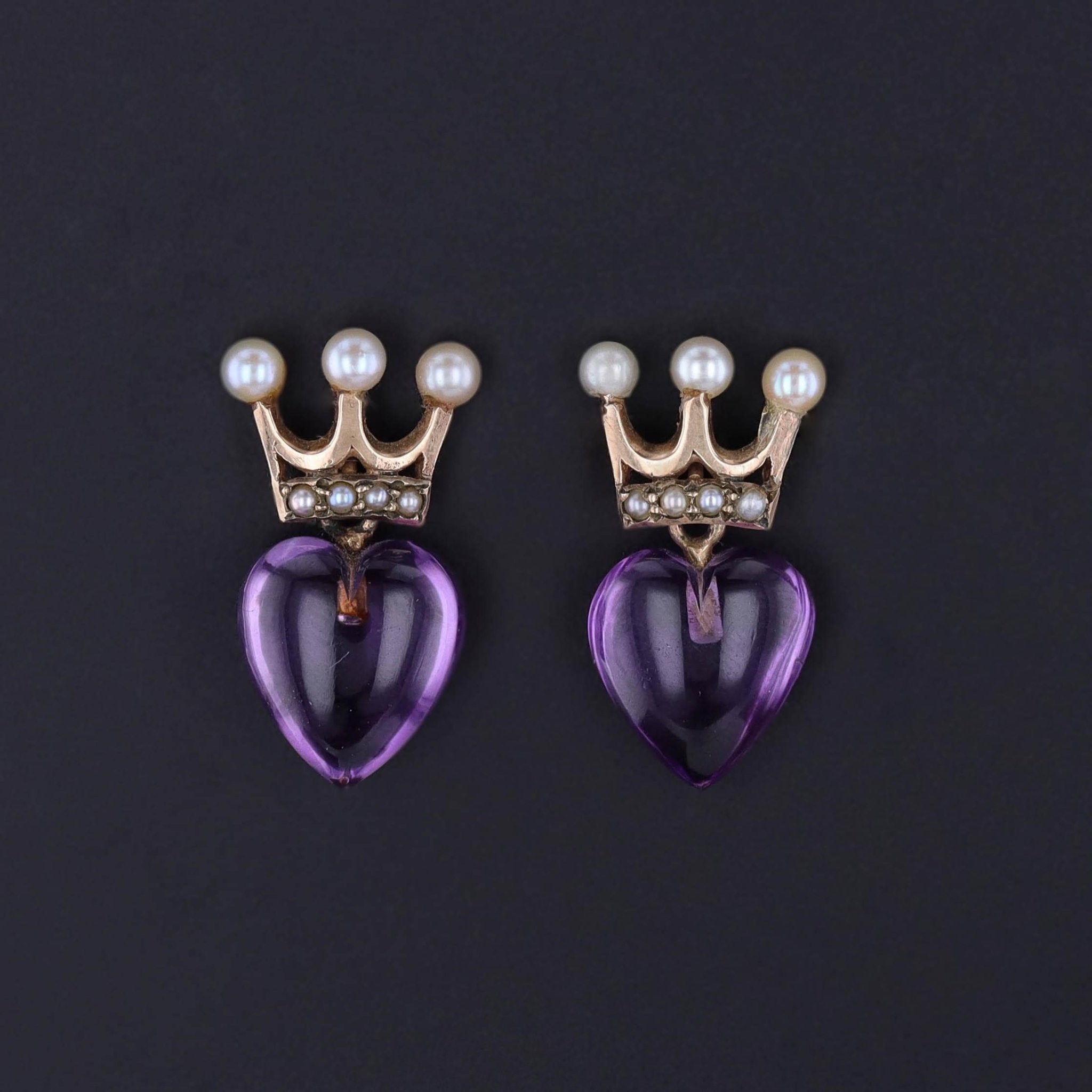 Antique Crowned Heart Earrings: These 9ct gold earrings (circa 1920) feature amethyst hearts with pearl studded crowns.