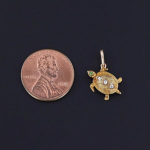 This golden charm depicts a finely wrought turtle of 15ct gold. The turtle's shell is accented with a row of 3 glistening mine cut diamonds and there is a demantoid garnet accenting its head. The charm was originally an antique stick pin (circa 1890-1910) that our jeweler transformed by removing the pin stem and welding on a 14k gold jump ring bail.