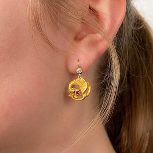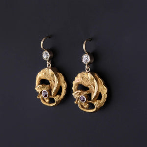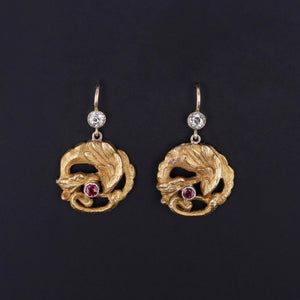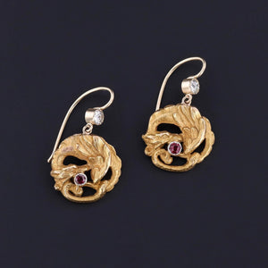 Antique Dragon Earrings: These earrings feature dragons of 18k gold with ruby accents. They were originally a pair of antique cufflinks (circa 1890-1900) that our jeweler transformed by adding 14k gold ear wires and diamond surmounts.