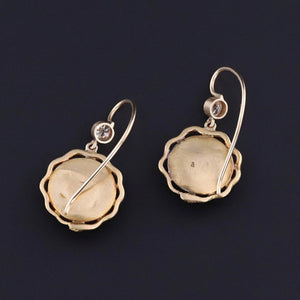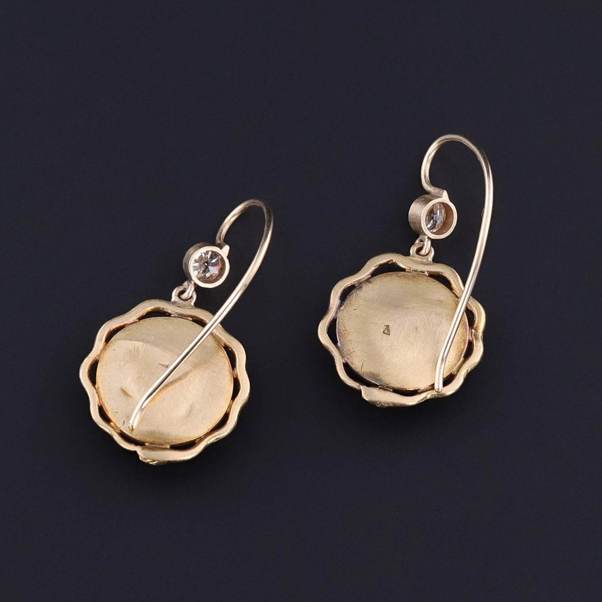 Our jeweler transformed the cufflinks into earrings by removing the hooks on the backs and adding 14k gold ear wires and diamond surmounts. The earrings are in great condition and have a combined weight of 4.64 grams.