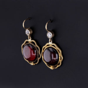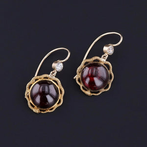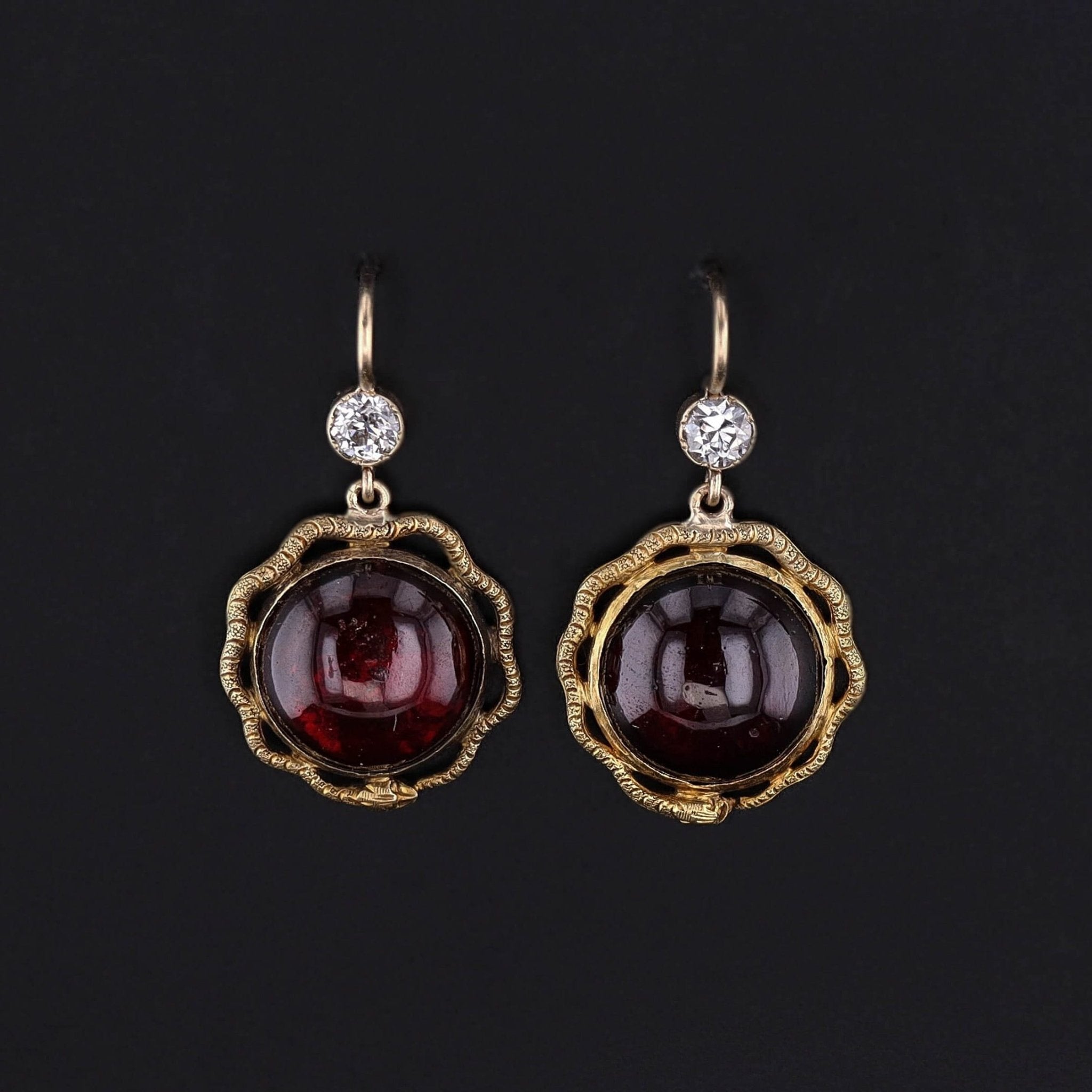 Antique Garnet & Diamond Snake Earrings: Make a bold statement with these captivating antique garnet and diamond snake earrings. The drops were originally 18k gold cufflinks from the late Victorian era. The garnet cabochons are encircled by ouroboros (snakes eating their tails)-- symbolizing rebirth, transformation, and eternal love.