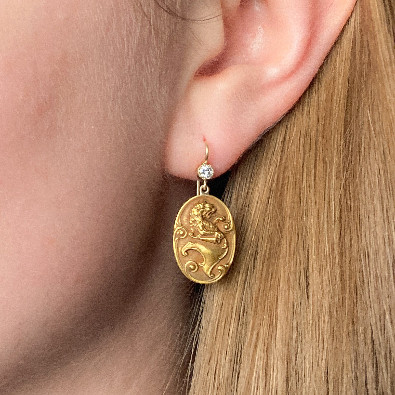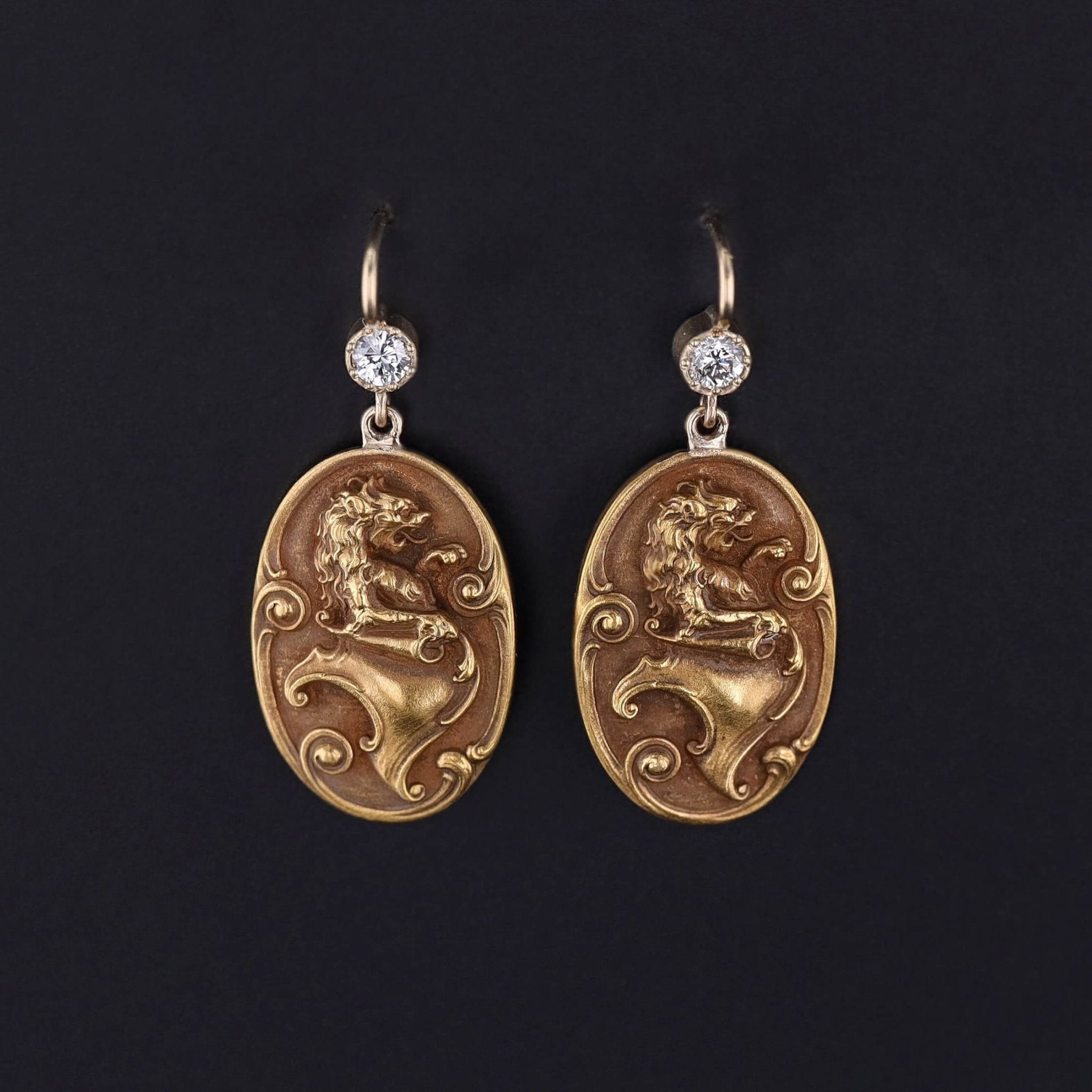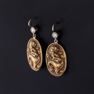 These 14k gold lion earrings were originally a pair of antique cufflinks (circa 1910-1920) that our jeweler transformed by removing the backs and adding 14k gold ear wires and diamond surmounts.