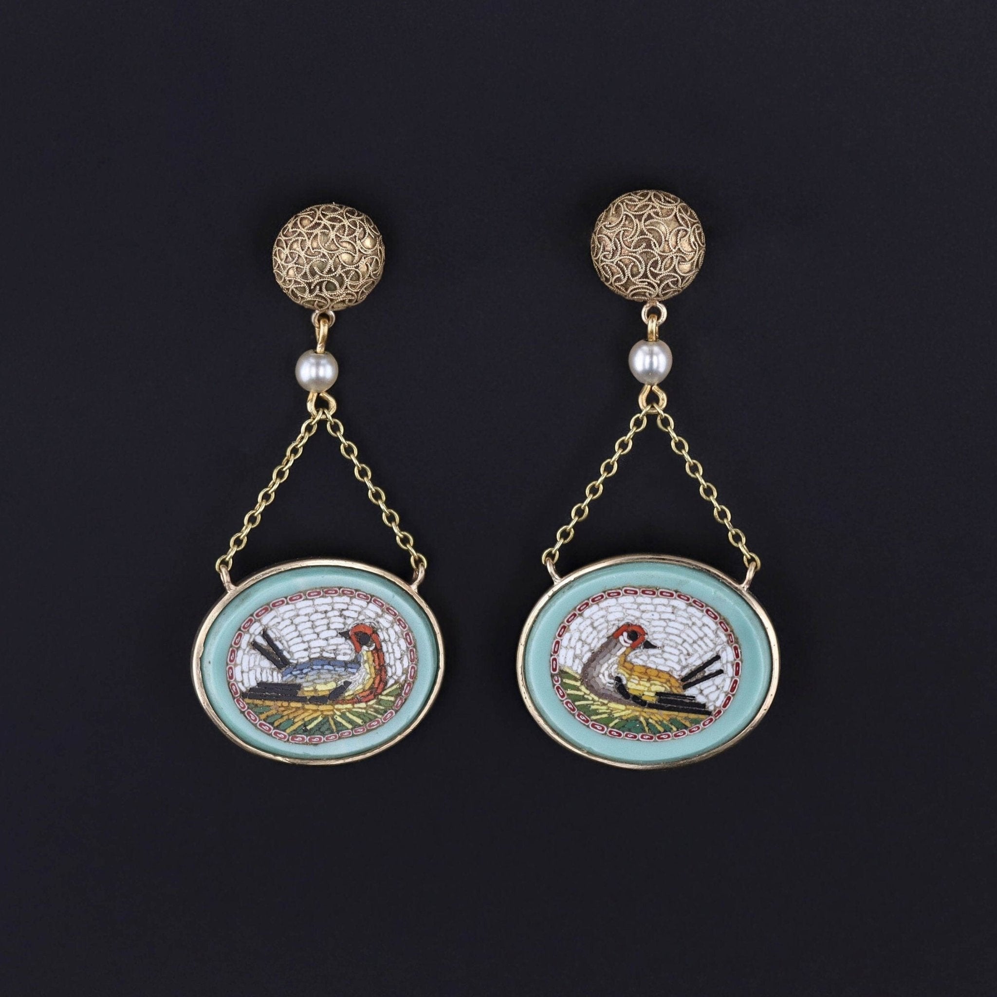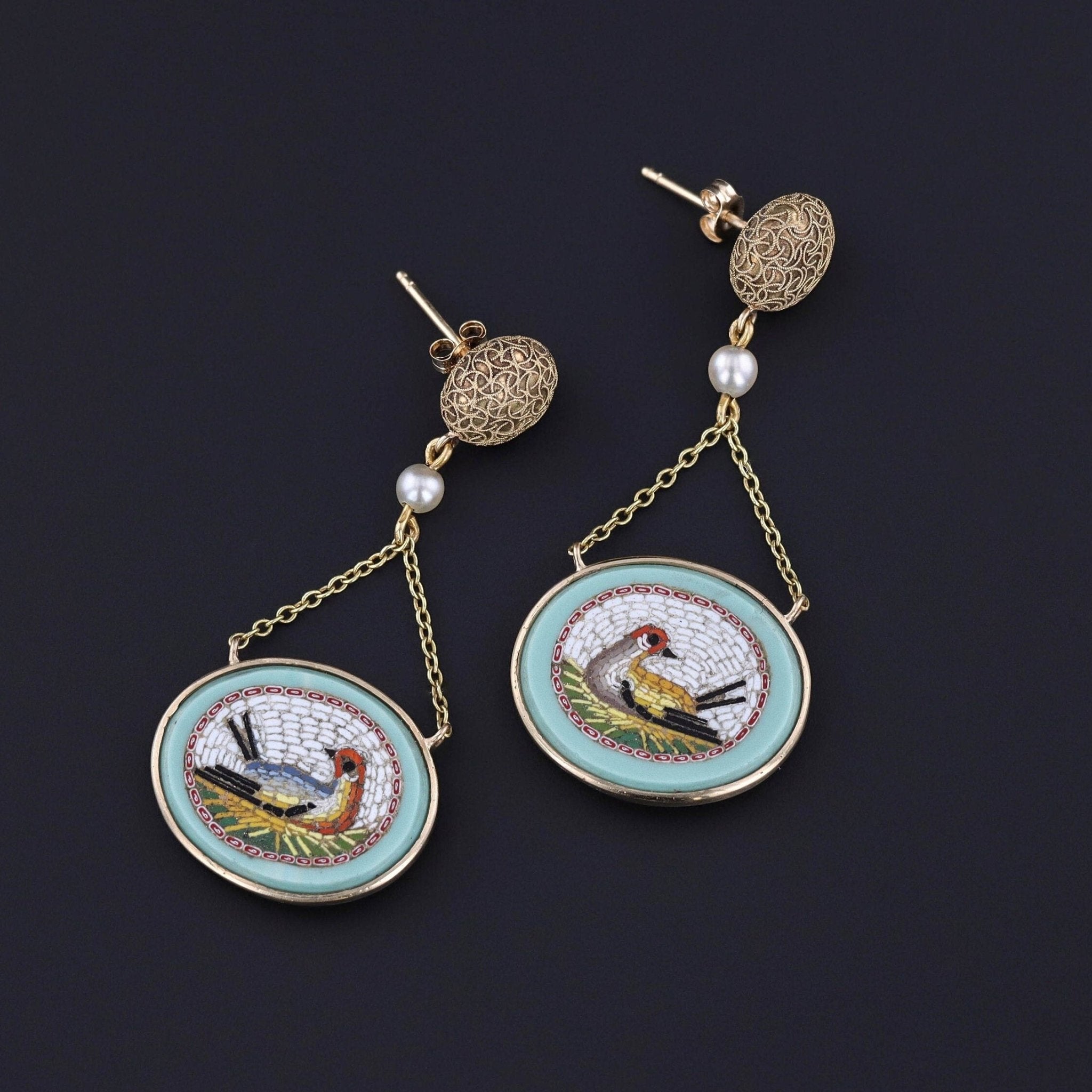 These striking 14k gold earrings were created from micromosaics dating to the Victorian era (circa 1840-1850). The finely rendered micromosaics are comprised of hand set glass tesserae depicting seated birds, and the ornamental tops were originally hat pins (circa 1880-1900).