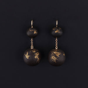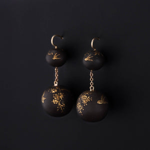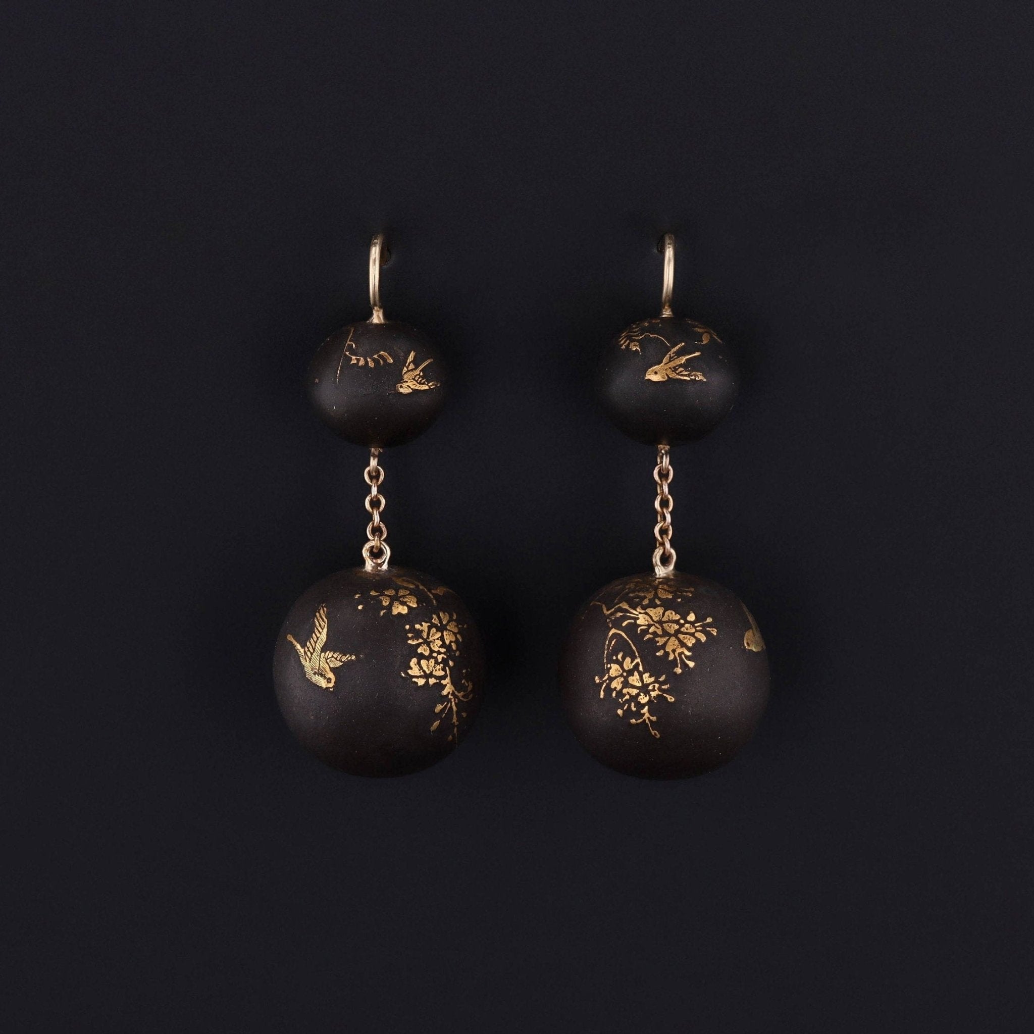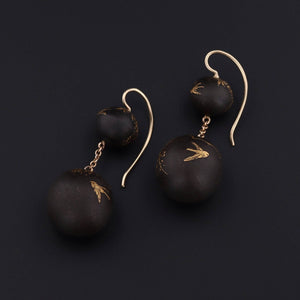 These elegant dangle earrings began their life as finely crafted antique beads from the late Victorian era, transformed into wearable works of art through a thoughtful conversion. Each bead is hand-etched in darkened metal, its surface highlighted with delicately applied gold accents that shimmer subtly with movement.