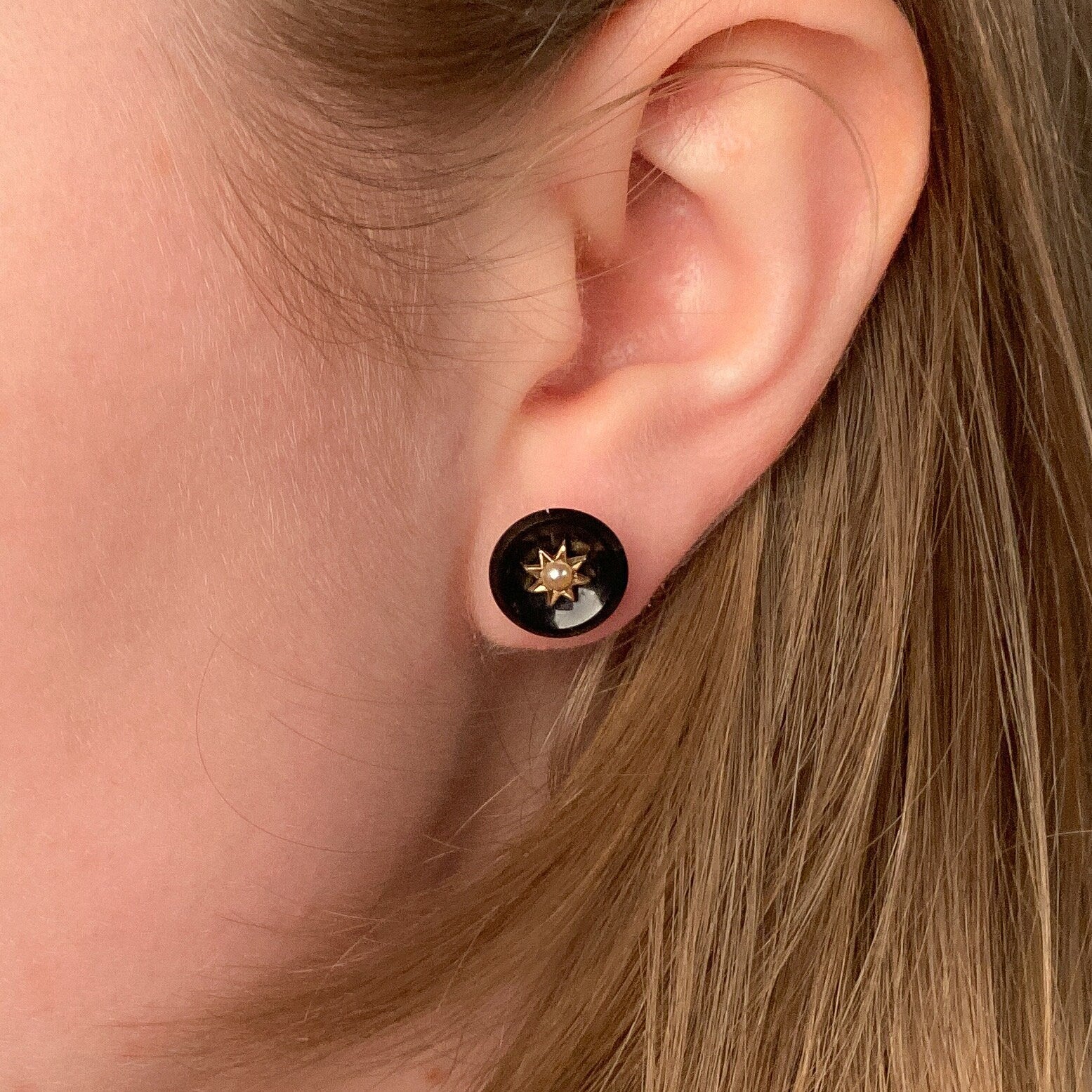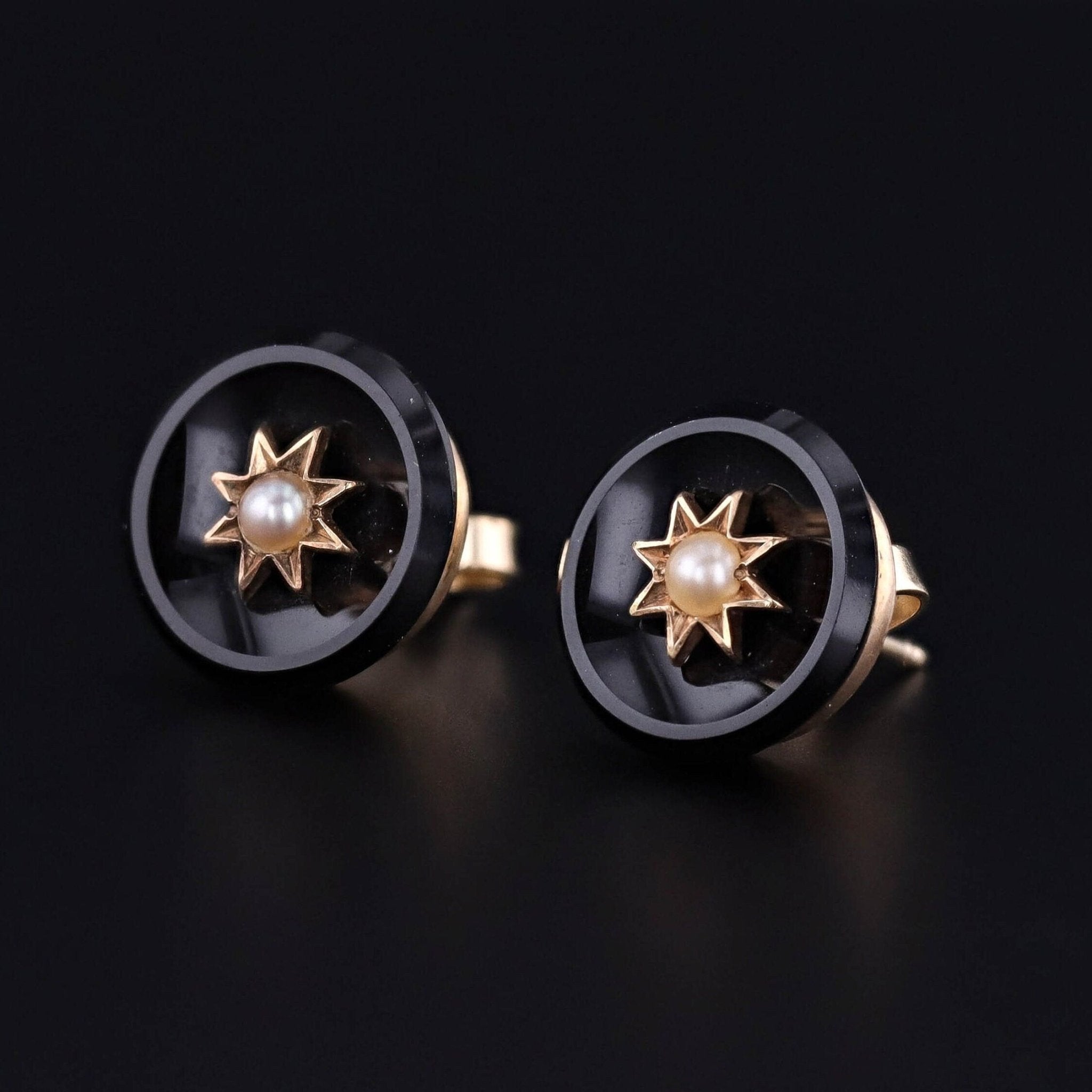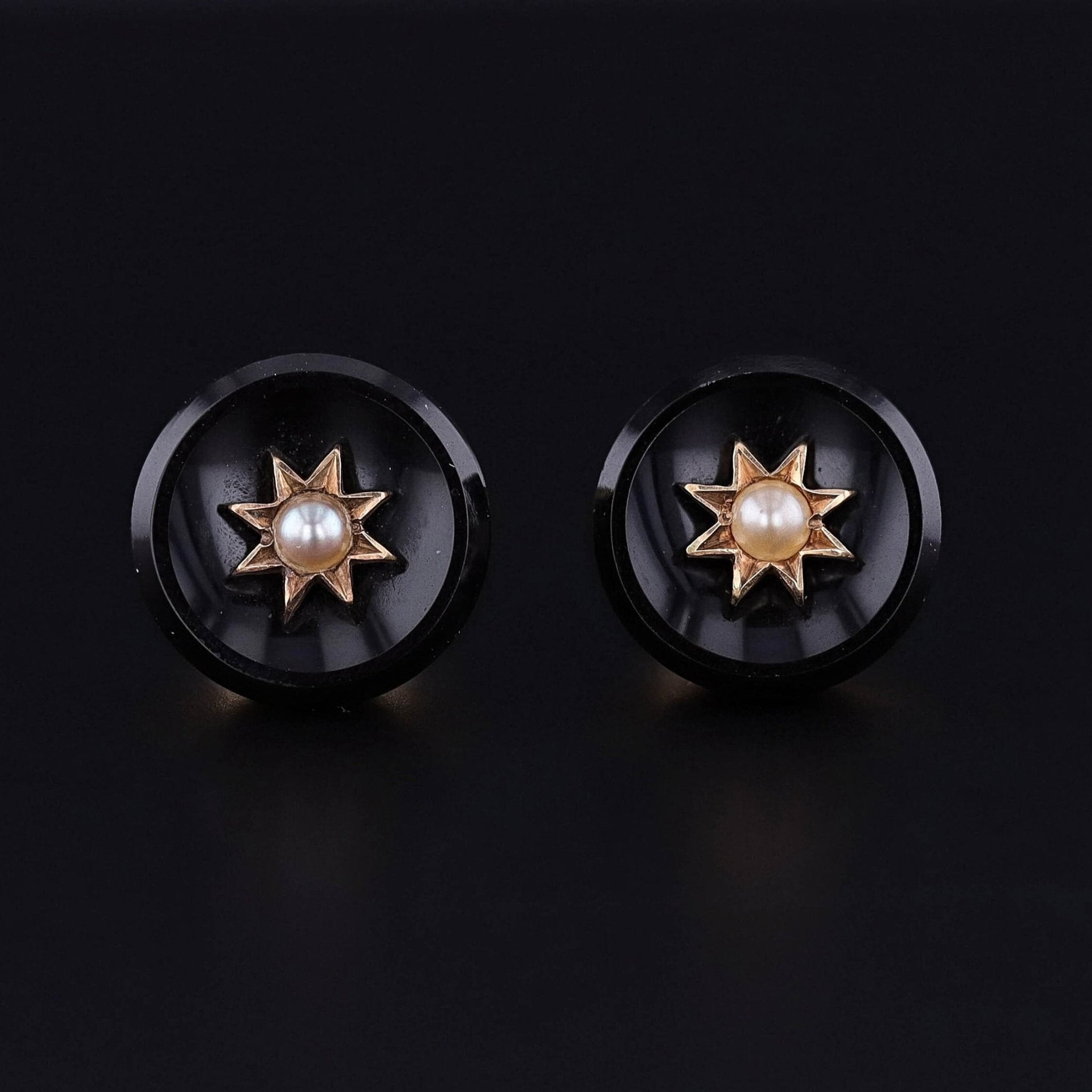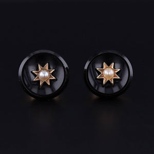 Striking earrings featuring pearl studded gold stars set atop black onyx.