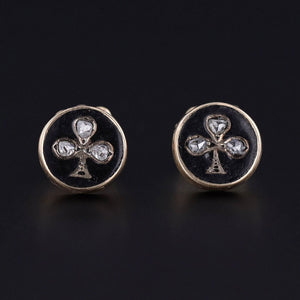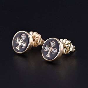 Antique Clover Diamond Earrings: Elevate your style with these stunning earrings, featuring clovers of rose cut diamonds adorned with black enamel on 18k gold. Originally part of an antique brooch dating back to 1880, our skilled jeweler has transformed them into elegant studs with 14k gold posts and backs.