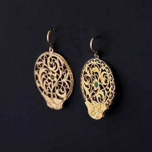 These slightly mismatched earrings were converted from antique Georgian watch cocks (circa 1780-1800) by adding 14k gold ear wires and tsavorite garnet to the gold gilt dangles.