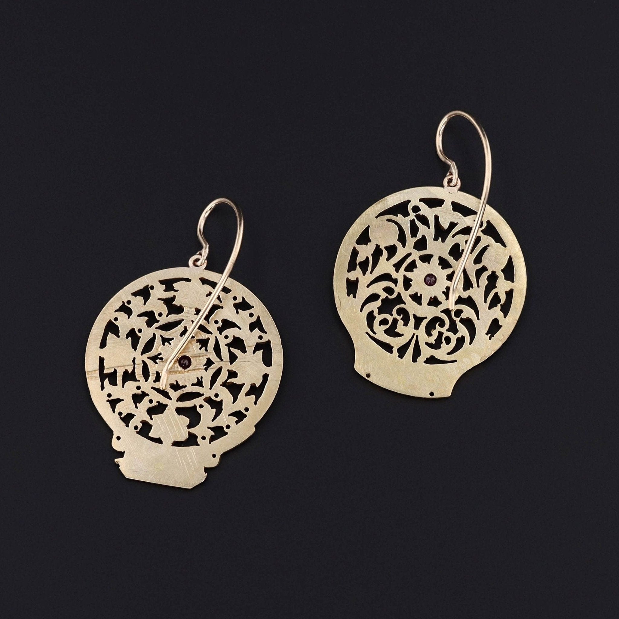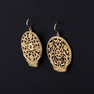 These antique earrings were created from Georgian watch cocks (circa 1780-1800) by adding rubies and 14k gold ear wires to the gold gilt dangles.