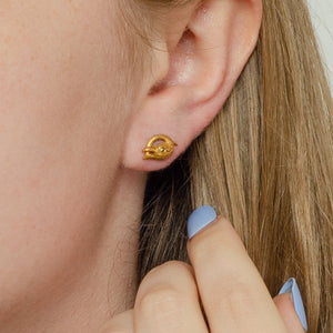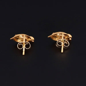These basilisk or dragon earrings were originally antique jewelry components (circa 1890-1900) transformed with the addition of 14k gold posts. The creatures are 14k gold and feature demantoid garnet eyes, and we have 2 pairs available for purchase.