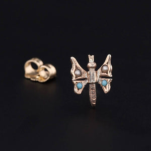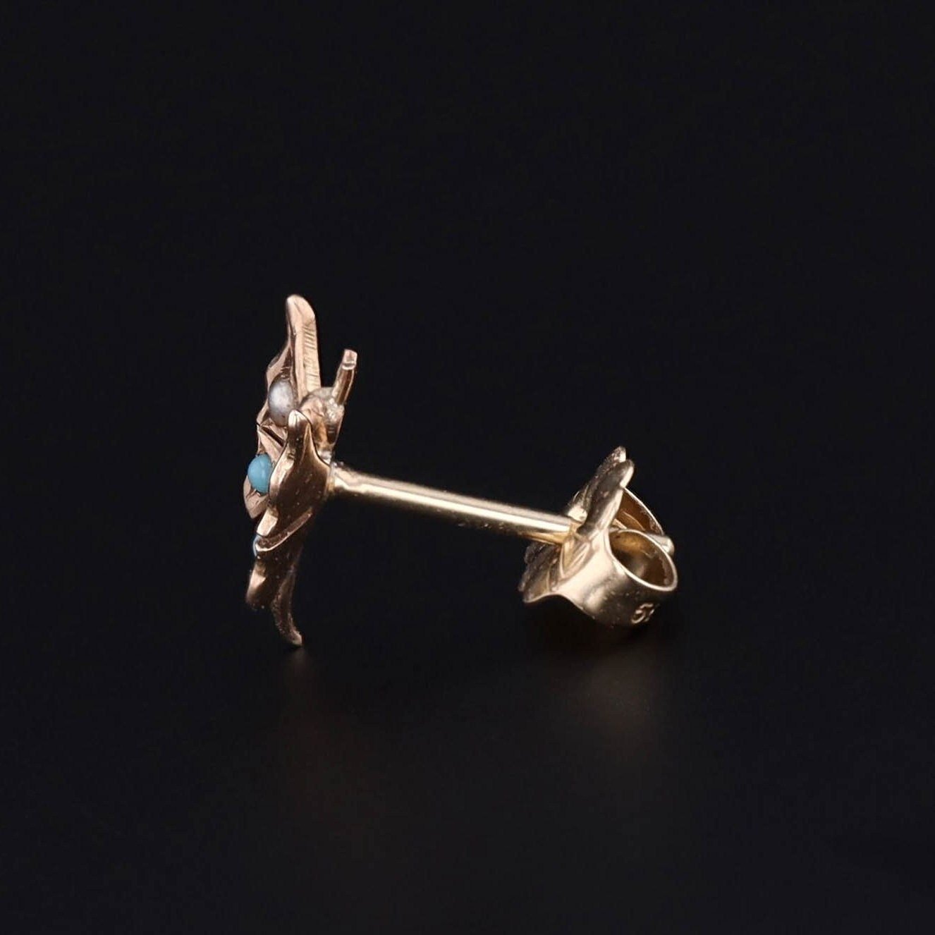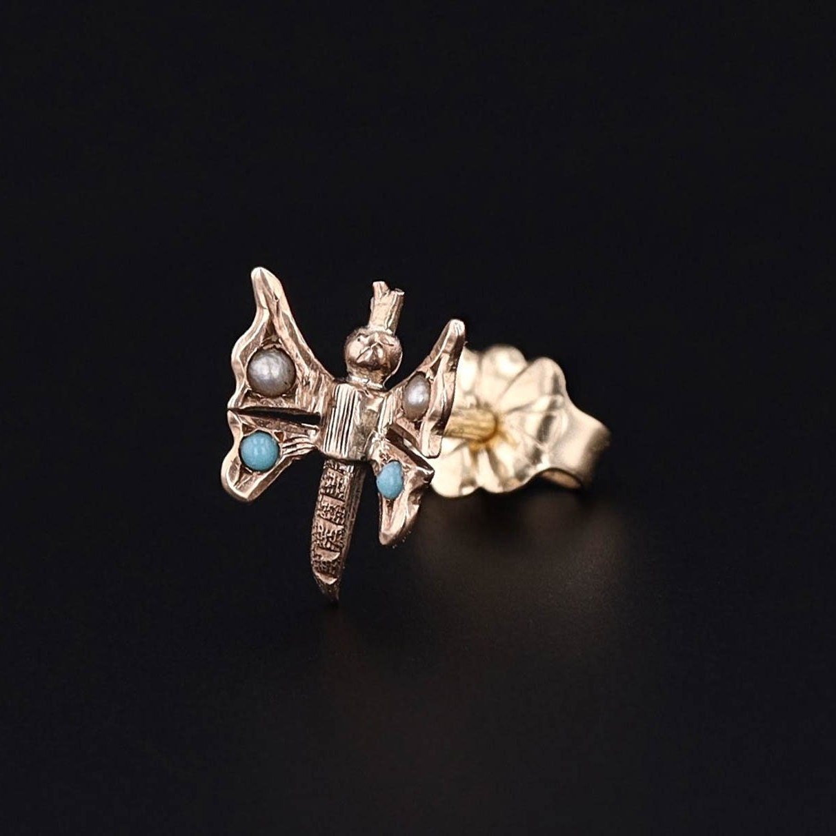The butterfly motif — a timeless symbol of transformation and renewal — is crafted in 10k gold and set with luminous turquoise cabochons and a petite natural pearl, creating a soft, romantic color contrast.