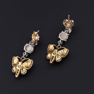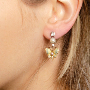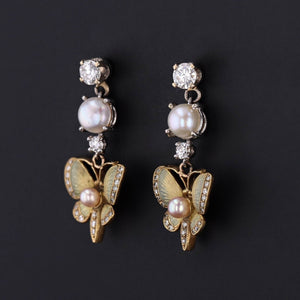 The butterflies are accented with iridescent enamel, post set pearls, and tiny diamond accents. They are suspended from a cascade of diamonds and with a split pearl in between. The largest round brilliant diamonds are approximately 0.18ct each and the total carat weight of the diamonds is approximately 0.50 ctw.