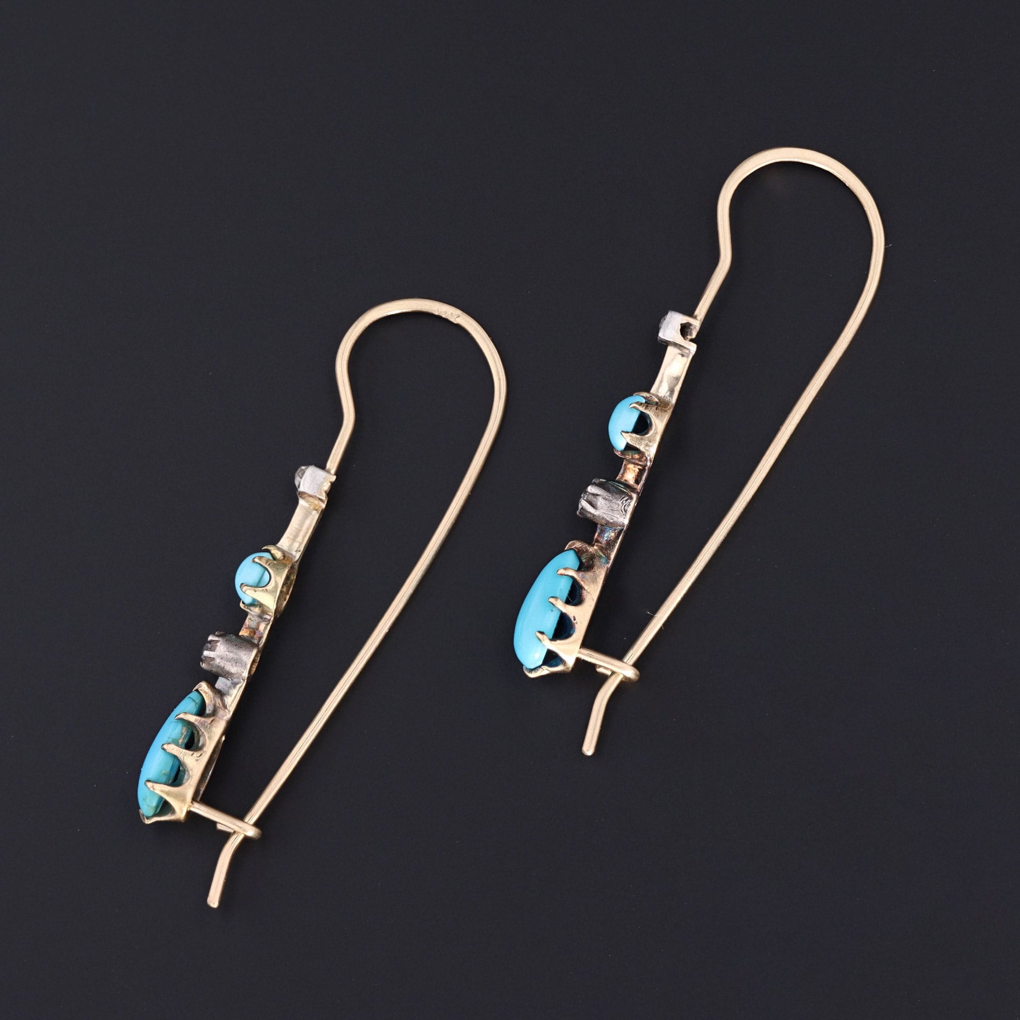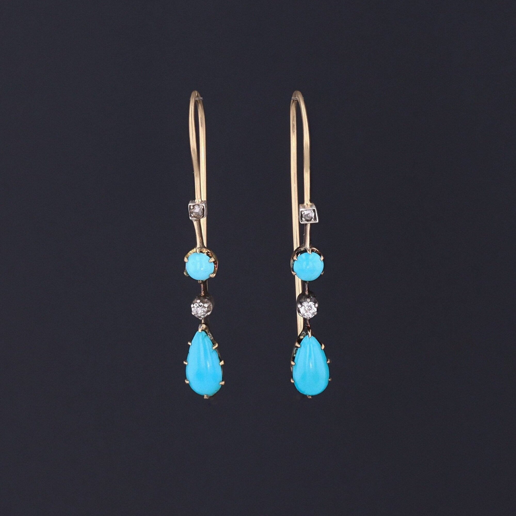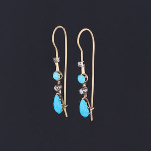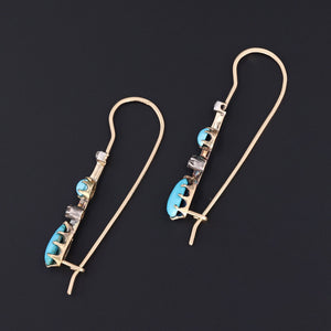 These earrings were originally necklace components transformed with the addition of long 14k gold ear wires. The earrings feature alternating vibrant blue turquoise and glittery diamonds. The diamonds are set in silver, while the turquoise components are set in 14k yellow gold.