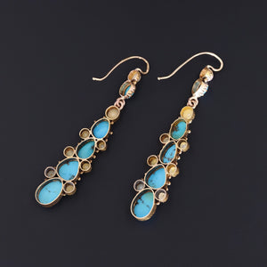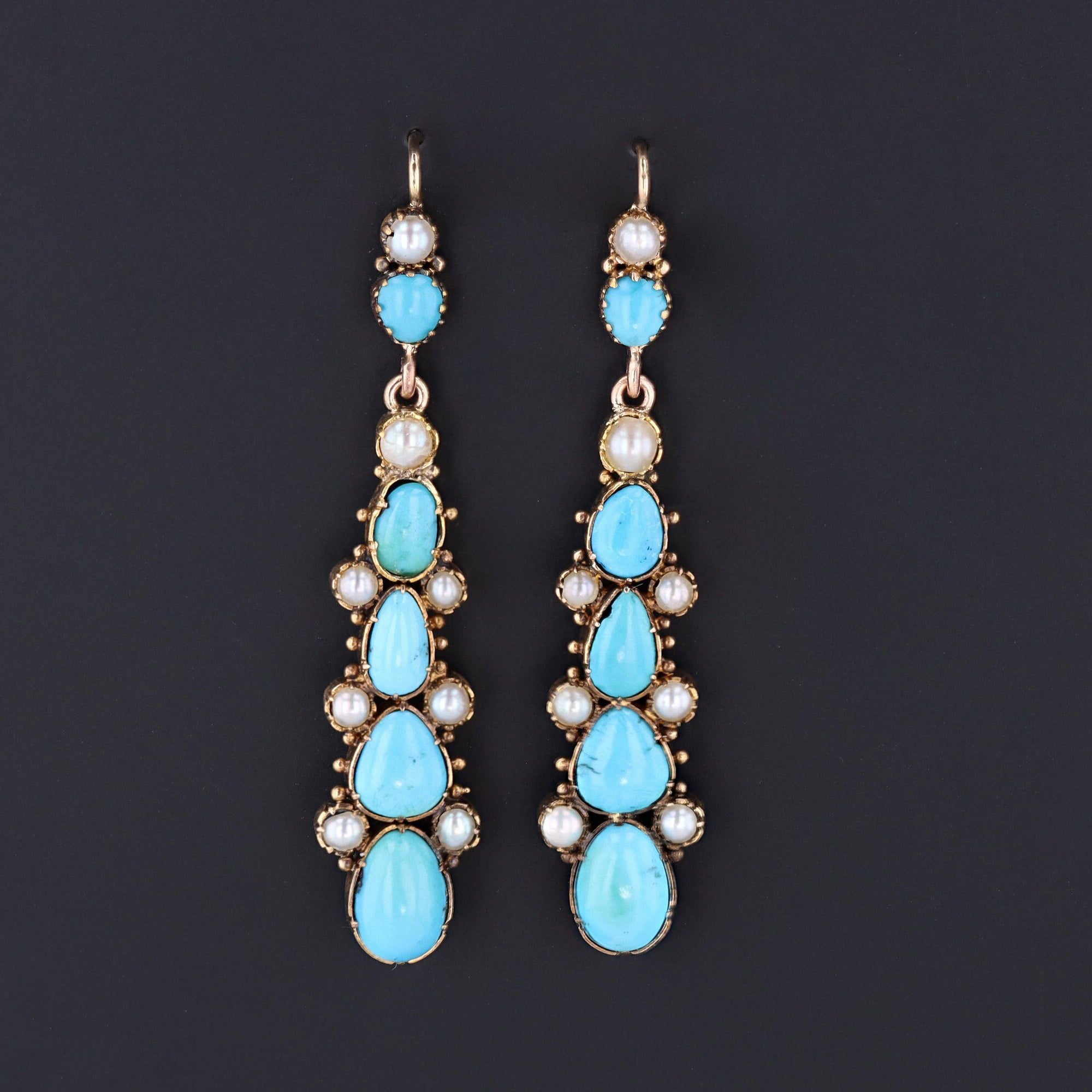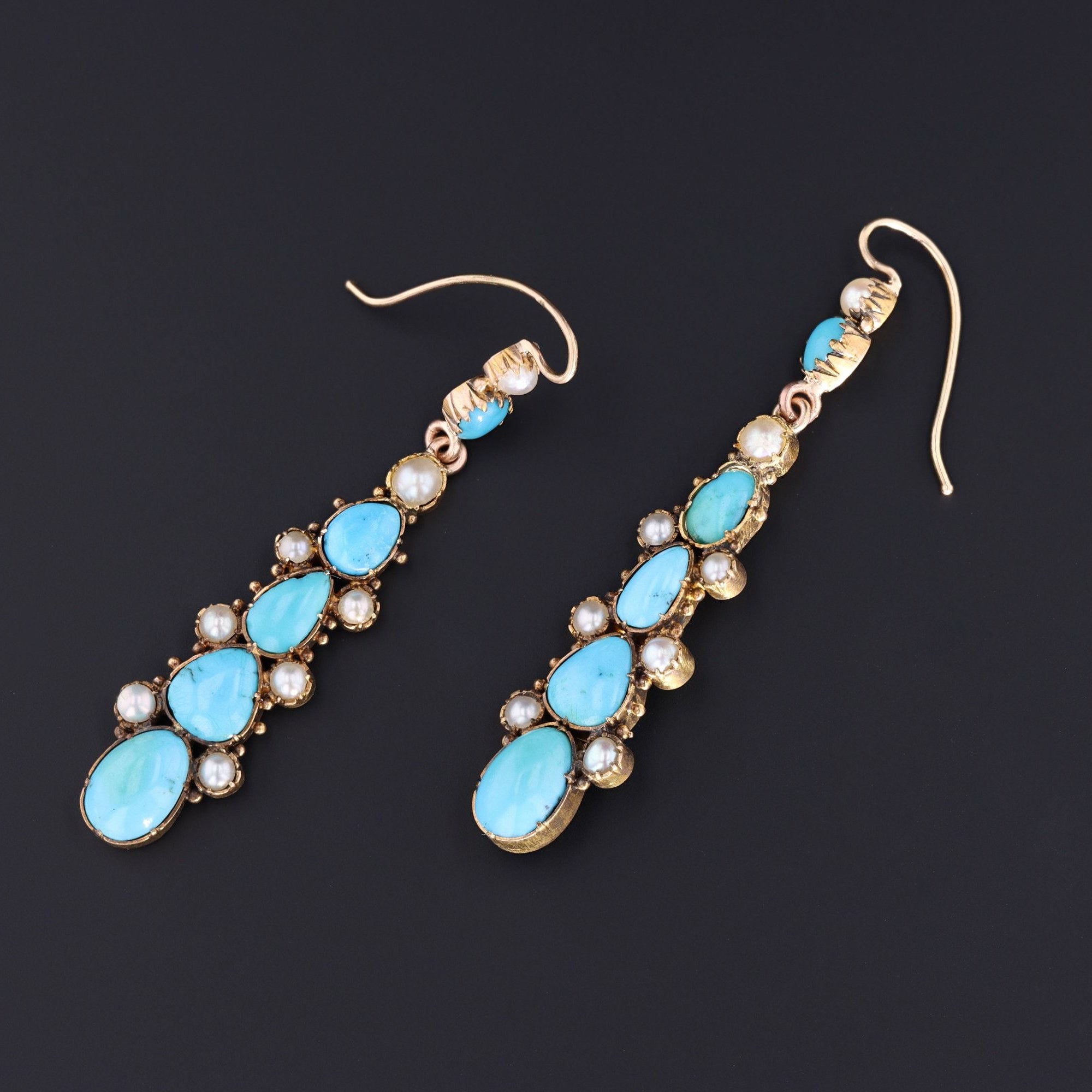 The 14k gold dangles measure 2.3 inches from top to bottom by 0.5 inches wide. They are in good condition; however, there is wear to the nacre of several of the half pearls and a chip to one of the turquoise cabochons (visible under magnification).