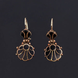 These Victorian earrings (circa 1880-1900) are 1.3 inches long and 0.5 inches wide. The dangles are plated in gold, while the ear wires (a later addition) are 14k gold.