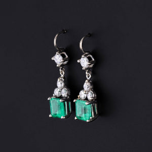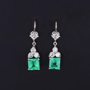 Elegant Art Deco era earrings (circa 1920-1930) featuring vivid slightly bluish green natural emeralds and modern round brilliant diamonds set in 14k white gold. The emeralds weigh 0.717 ct and 0.712 ct each and the diamonds are G-H color with a total carat weight of approximately 0.65ct.
