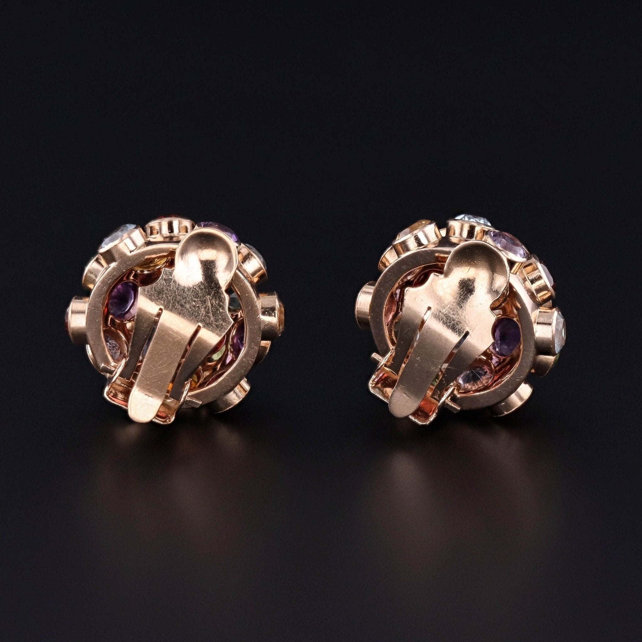 These vintage clip on earrings (circa 1960) features sputniks of 18k gold with assorted gemstones including aquamarine, peridot, citrine, amethyst, garnet, and tourmaline.