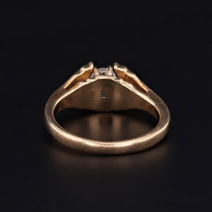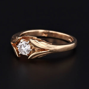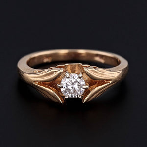This attractive ring (circa 1950-1965) features a 0.28 carat modern round brilliant diamond of H-I color, I1 clarity set in a 14k yellow gold mounting (marked).
