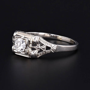 This delightful ring features an 18k white gold filigree mounting with a 0.24 carat modern round brilliant diamond of E color, SI1 clarity.