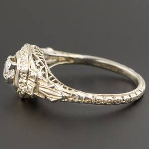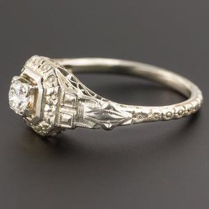 This beautiful ring features an elegant filigree mounting crafted of 18k white gold with an embossed floral design surrounding the diamond. The diamond is a 0.22 carat modern round brilliant stone of H-I color, VS2-SI1 clarity.