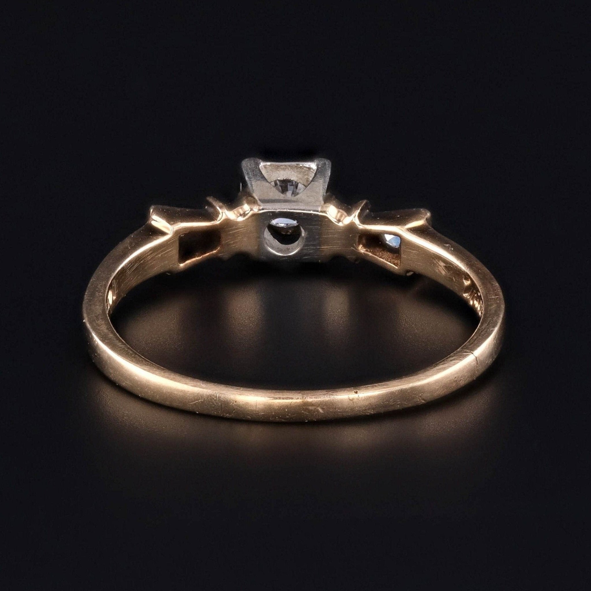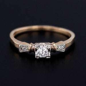 A graceful expression of mid-century refinement, this vintage engagement ring (circa 1950) features a classic three-stone design centered on a dazzling modern round brilliant cut diamond, graded F–G color, VS2 clarity, with an approximate weight of 0.130 carats. Flanked by two smaller accent diamonds, the total carat weight of the piece is 0.17 carats, offering a refined sparkle with excellent clarity and color balance.
