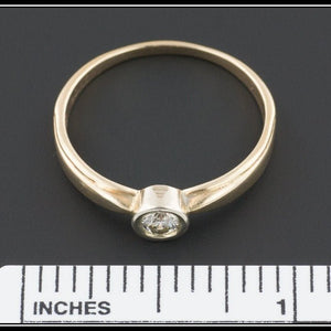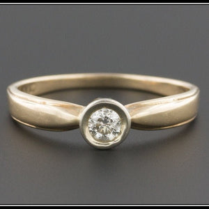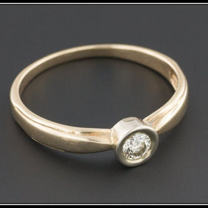 A lovely vintage engagement ring (circa 1980) featuring a 20 point (0.20 carat) modern round brilliant diamond of K color, SI2-SI3 clarity set into a white gold collet on a yellow gold band. This ring is fashioned from 10k gold and in very good condition.