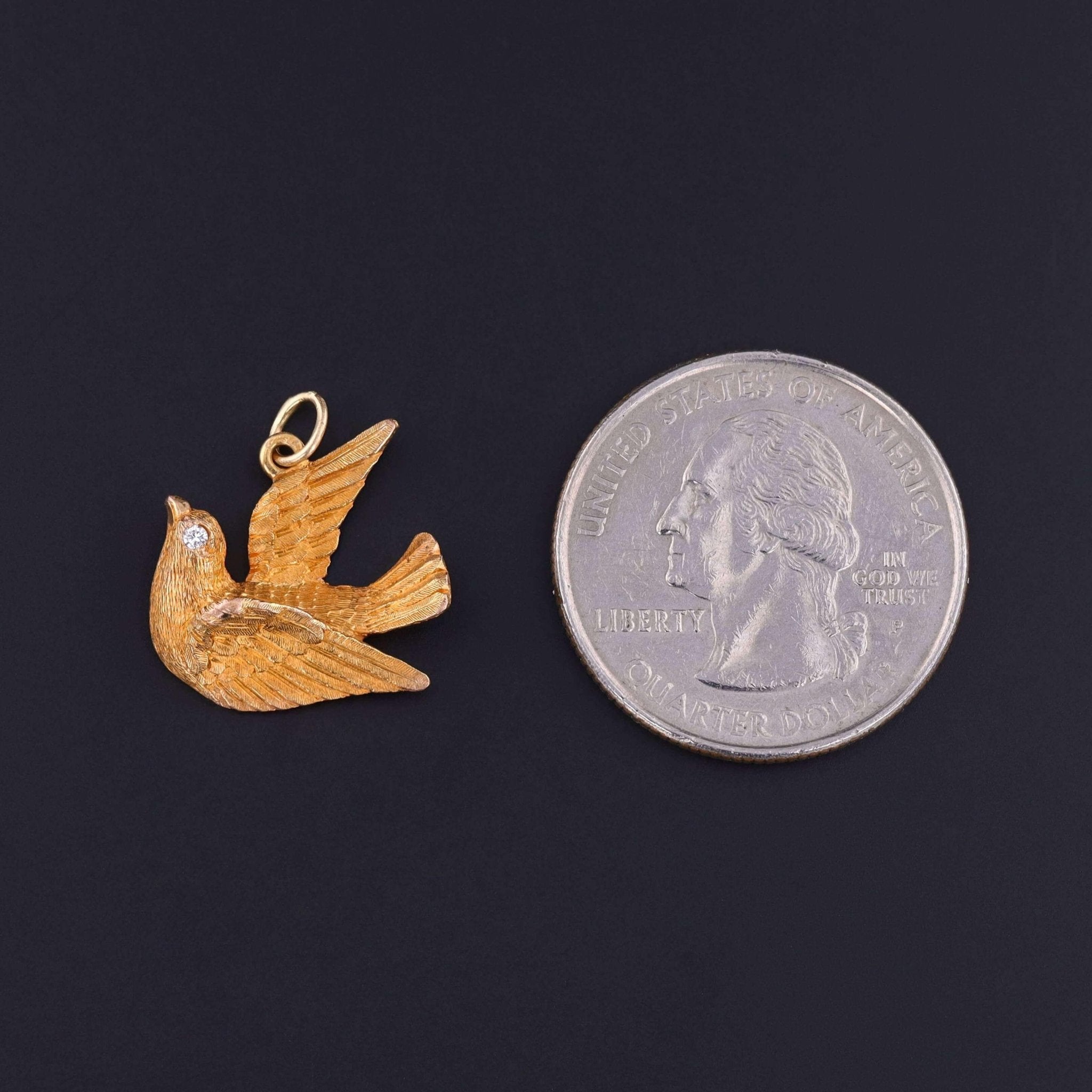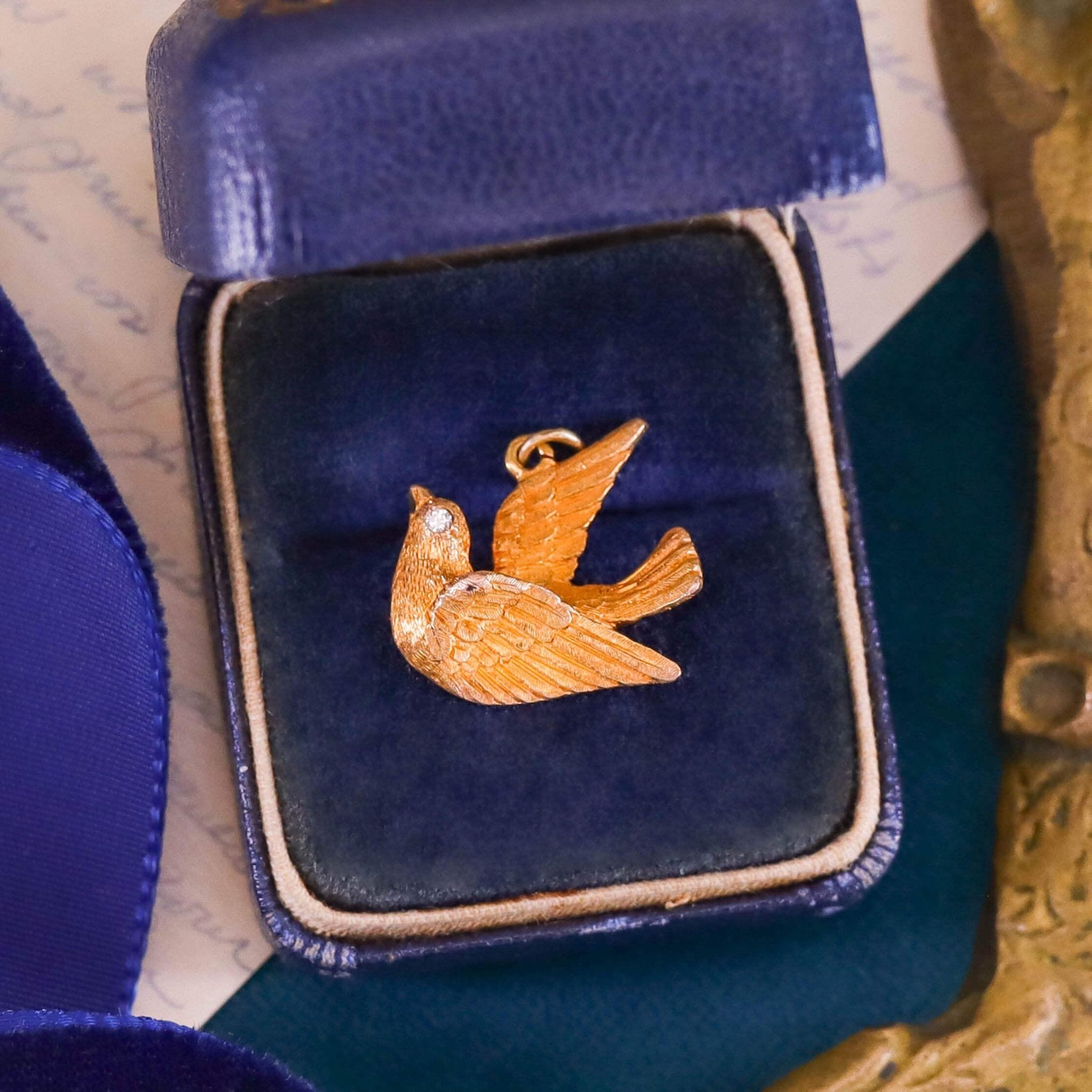 A charming antique pendant, circa 1910, featuring a beautifully sculpted bird in solid 15ct gold, poised in flight and accented with a single sparkling diamond eye that adds a touch of brilliance and personality to the design. The detailing captures the grace and vitality of early 20th-century naturalistic jewelry.