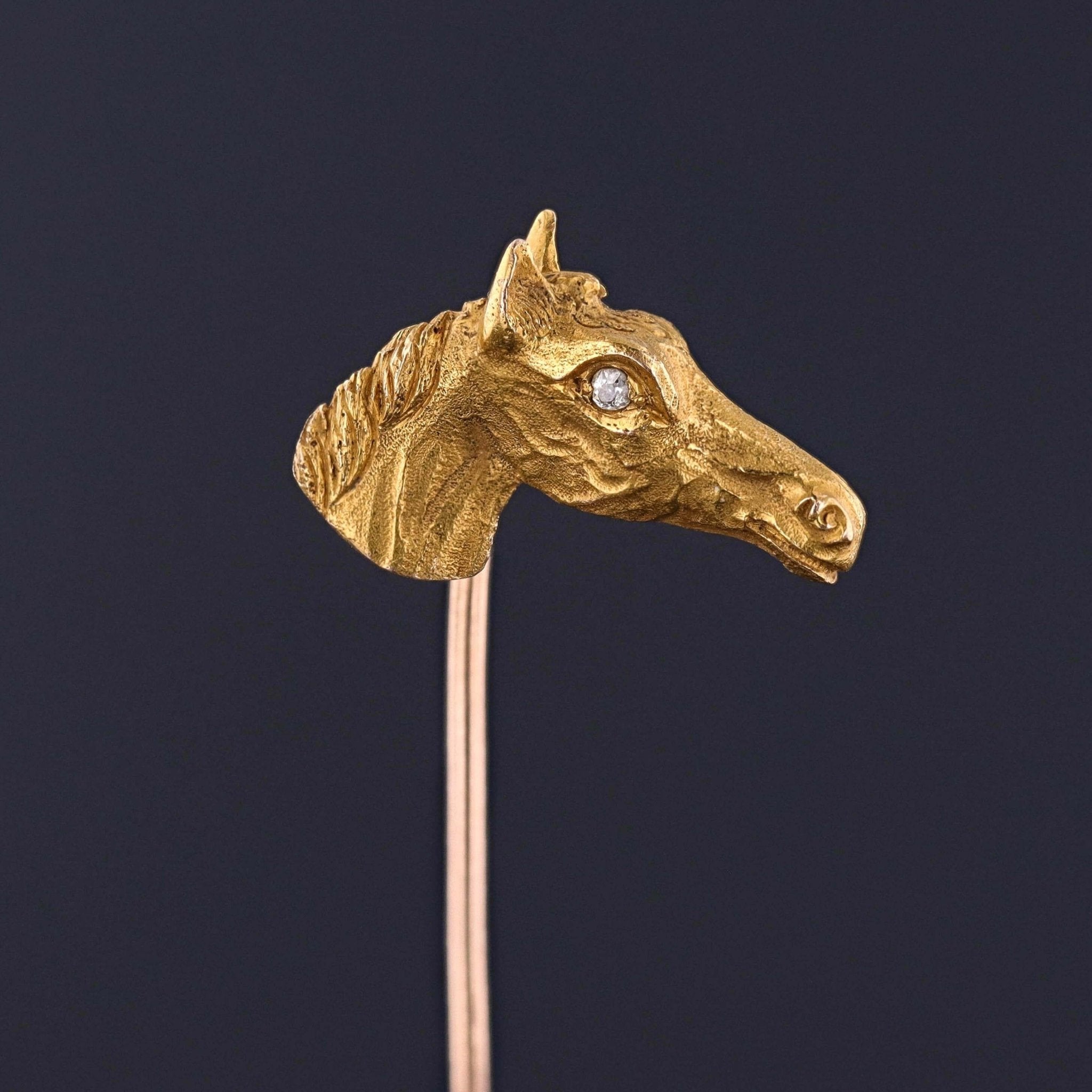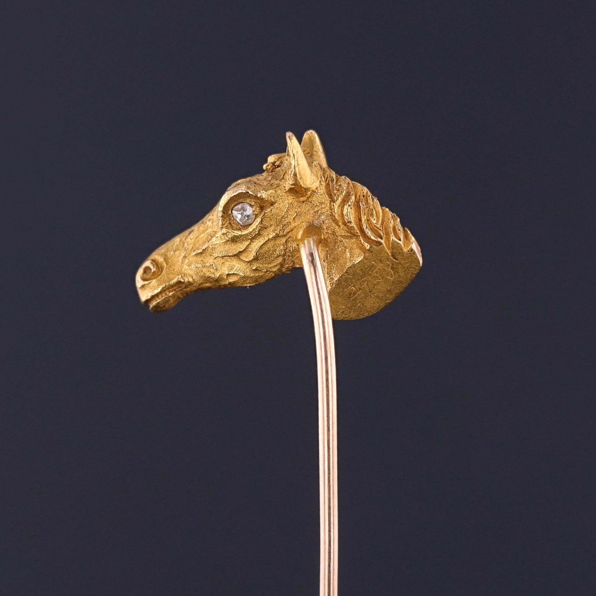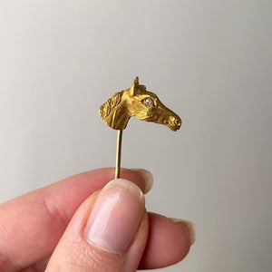 A distinguished solid gold stickpin from circa 1900–1910, featuring a finely sculpted horse head in solid 14k gold, accented with two old mine cut diamond eyes that bring lifelike expression and depth to the design. The craftsmanship beautifully captures the strength and elegance of the equine form, a popular motif in Edwardian-era jewelry.