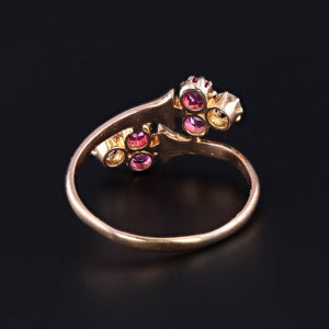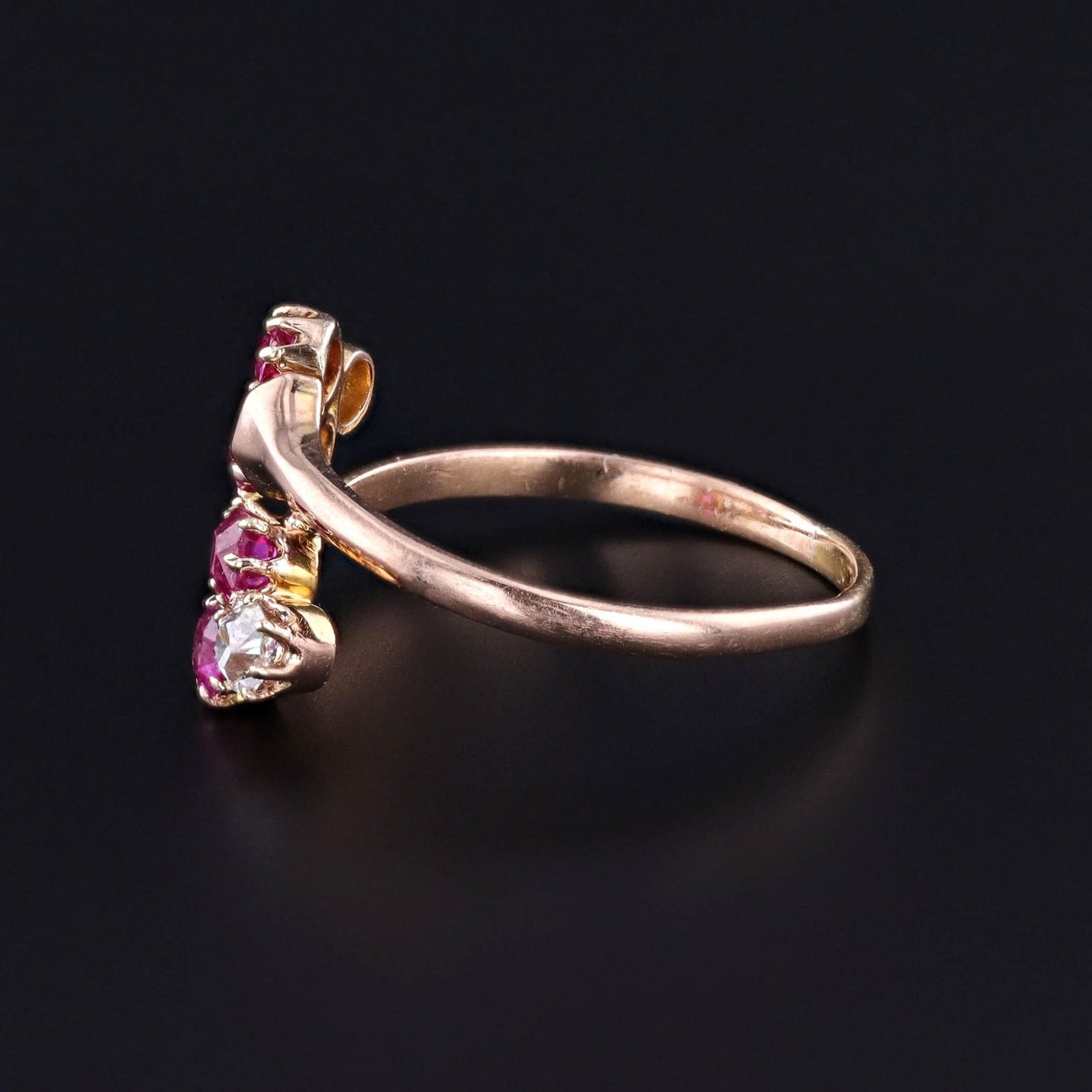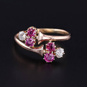 Antique Ruby and Diamond Crossover Ring: Embrace history with this enchanting antique ring dating to the late Victorian era (circa 1890-1900). The ring is adorned with vibrant natural round cut rubies and sparkling old mine cut diamonds set in an 18k rose gold.
