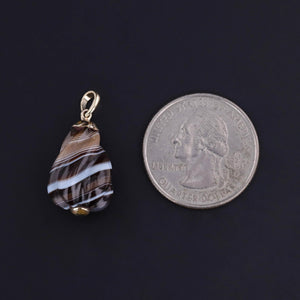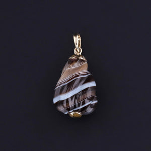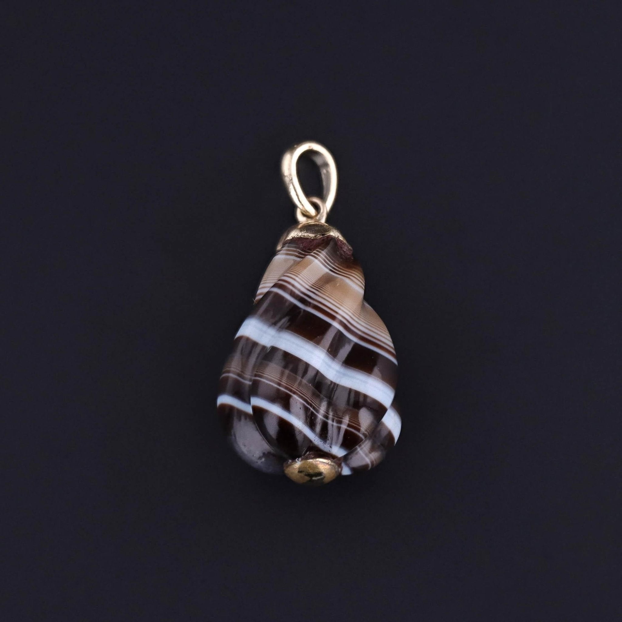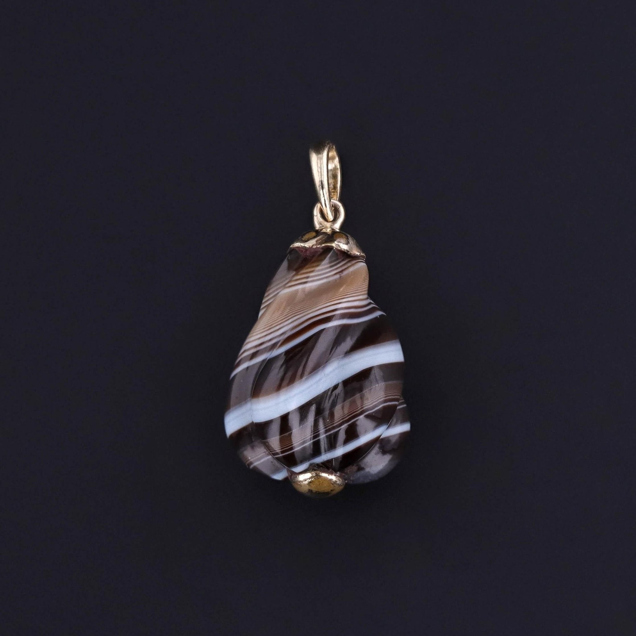 Striking in its simplicity and sculptural form, this antique pendant features a beautifully carved banded agate with raised ridges that add both texture and visual depth. The stone’s natural striations—ranging from deep espresso to translucent white—create a captivating interplay of light and shadow, accentuating its organic elegance.