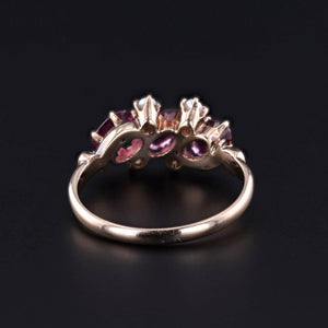Antique Garnet Ring: This antique ring (circa 1890-1900) features three rhodolite garnets with four pearl accents set in 9ct gold.