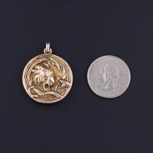 This rare and striking Art Nouveau locket, crafted in solid 10K gold, depicts a powerful lion or tiger engaged in battle with a snake, set amidst tall grass. A dramatic and symbolic design, this piece embodies the Art Nouveau era's fascination with nature, mythology, and the struggle between strength and cunning.