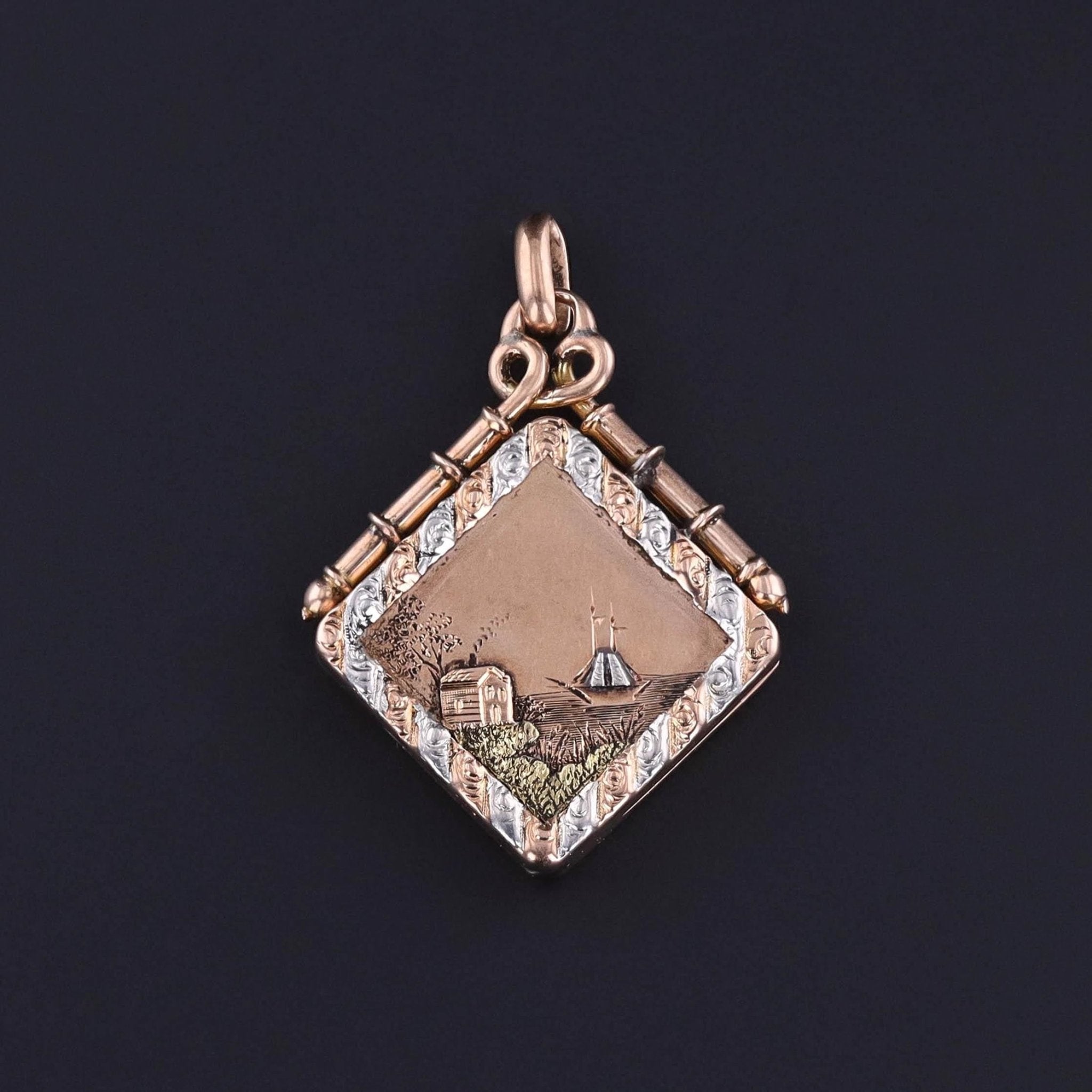 Antique 10k Rose Gold Sailboat Locket: This exquisite Victorian-era locket (circa 1890), captures the serene beauty of a sailboat gliding along a shoreline. Crafted in 10k rose gold, the detailed design is beautifully accented with 14k yellow gold and platinum, adding depth and contrast to the nautical scene. The reverse is engraved with the worn initials REM.