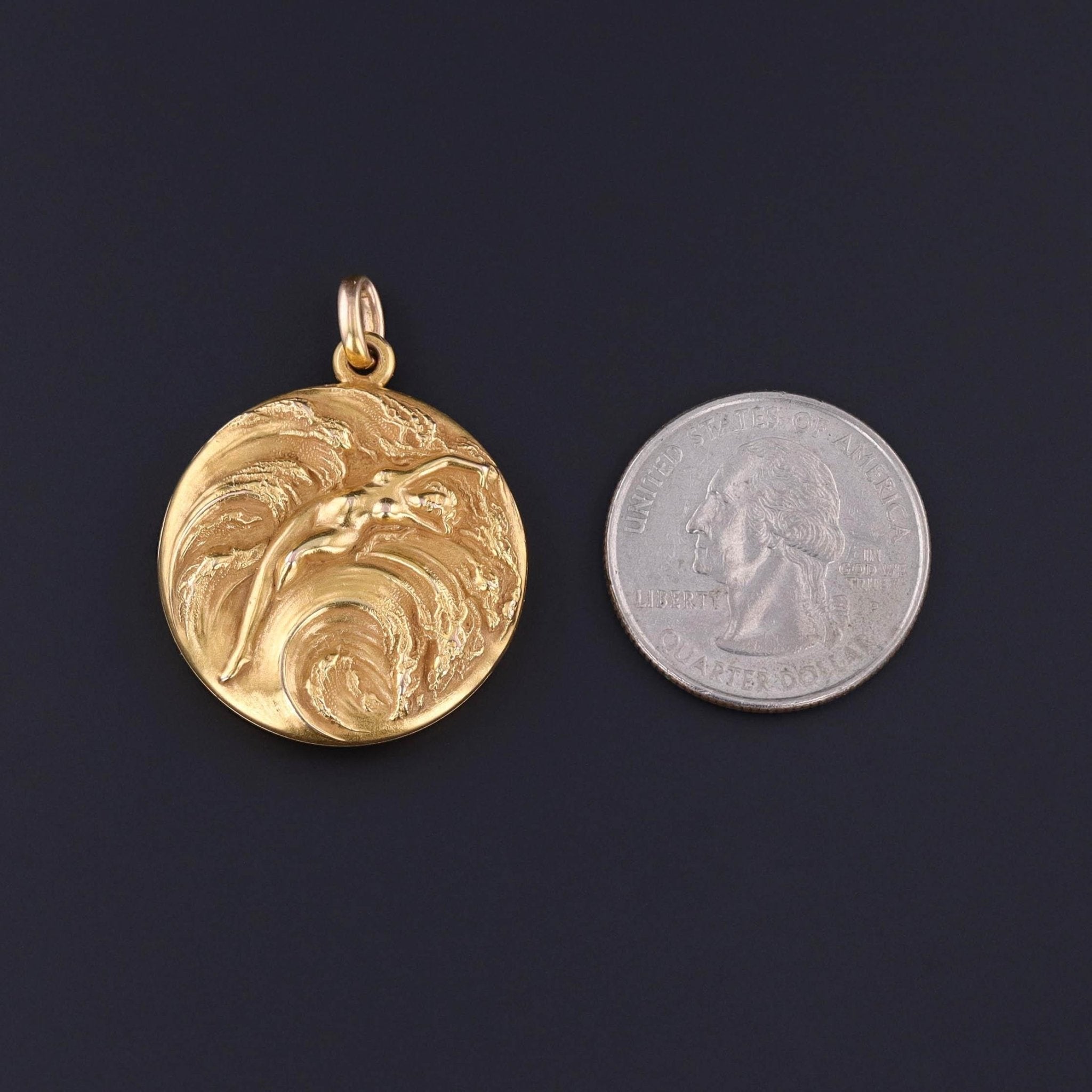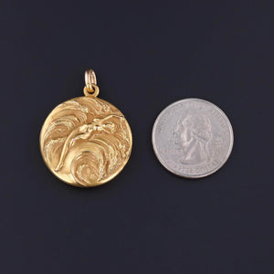 Antique Woman in Ocean Locket- This 14k gold Art Nouveau era locket (circa 1900-1910) depicts a nude woman outstretched in crashing waves. The reverse is engraved with scrolling initials.