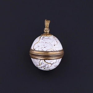 A rare and poetic piece of 19th-century craftsmanship, this antique locket (circa 1850–1870) takes the form of a finely constructed copper orb, hand-enameled in white and pink to represent the Earth in soft, abstracted topography. Both symbolic and sculptural, the orb twists open into two hemispheres, revealing a hidden compartment—suggestive of secrets kept, journeys imagined, or keepsakes cherished.