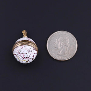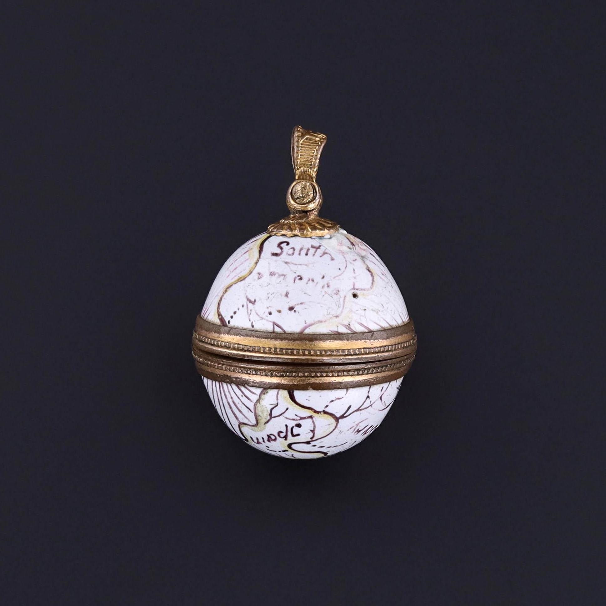 Measuring approximately 1.2 inches from the top of the bail to the bottom and 0.8 inches in diameter, the piece weighs 6.23 grams. It is in very good antique condition, with some minor wear and small enamel losses consistent with age and the delicate nature of early enamel work. The orb opens and closes securely.