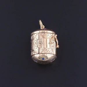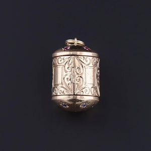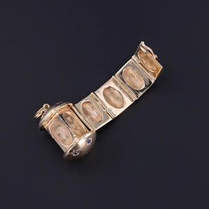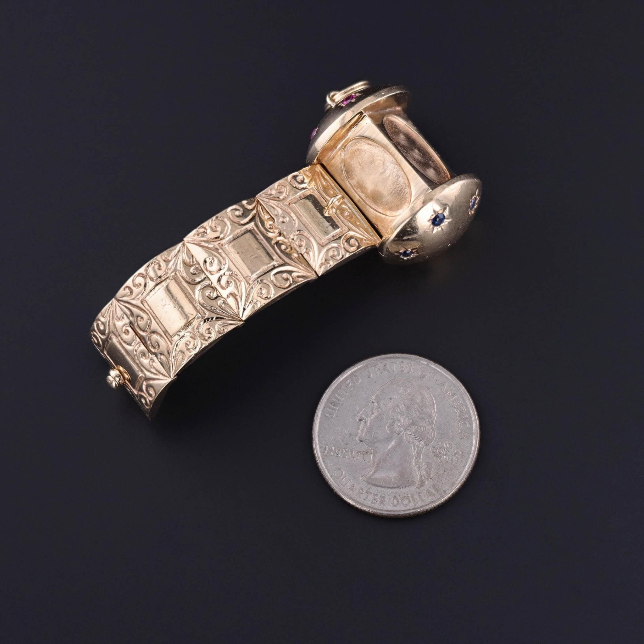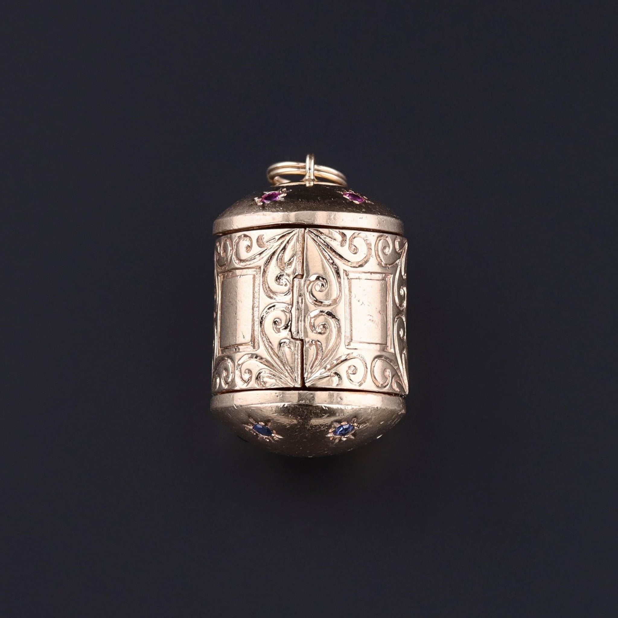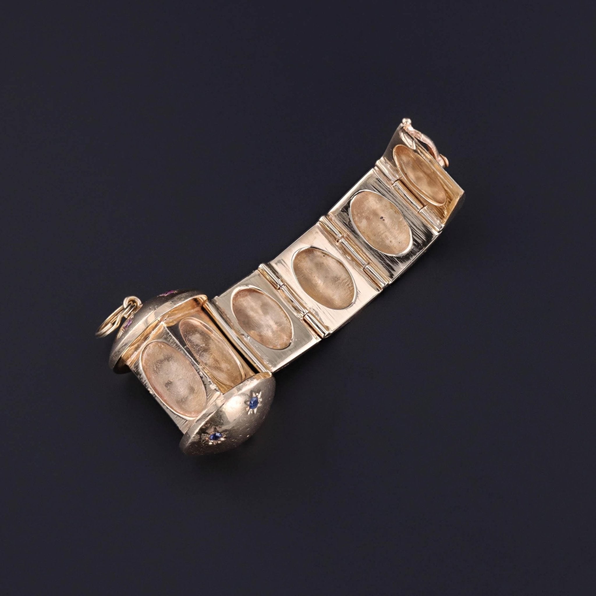 Antique Multi Photo Locket: This 14k gold locket dates to the 1930s and expands to reveal 8 photo panels. Rubies and sapphires adorn the top and bottom of the locket.
